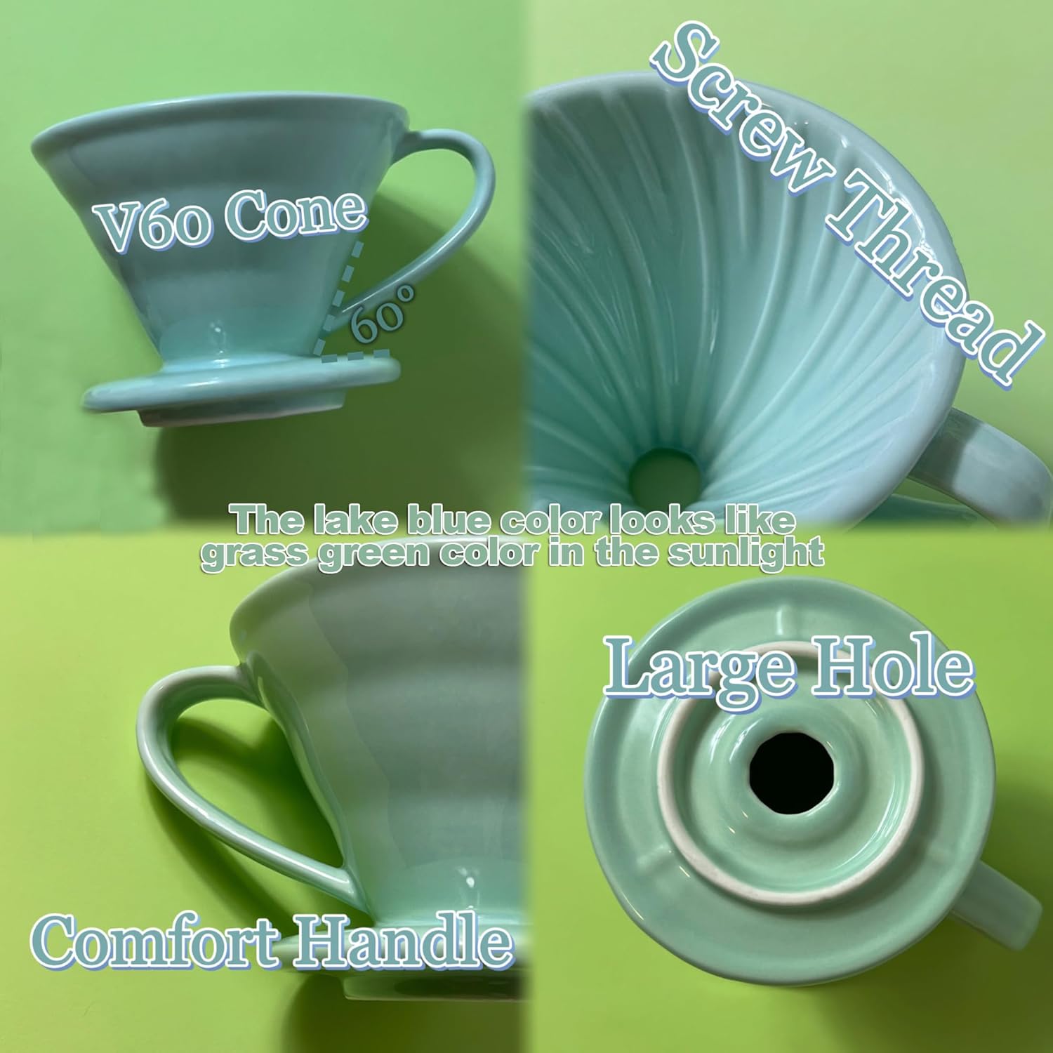 - ☕【V60 & Threaded Design】 Wmazio V60 dripper features a 60° cone angle. It's unique spiral design, which effectively expands the water absorption time of coffee grounds, thus making the extracted coffee more balanced and less likely to be under-extracted. This allows for maximum extraction during the pour over. The spiral ribs also create an air gap between the filter and the cone's wall, making room for the coffee to expand and extract more evenly. The result is great tasting coffee.