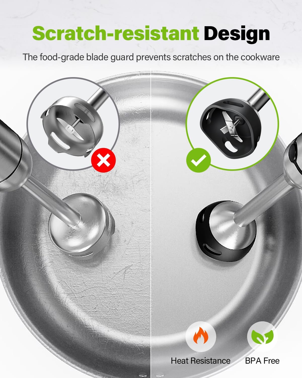 - 【Prevent Scratches & Splatters】Scratch-resistant blade guard—blend directly in your containers without damage. Bell-shaped guard reduces splatter for faster, smoother blending