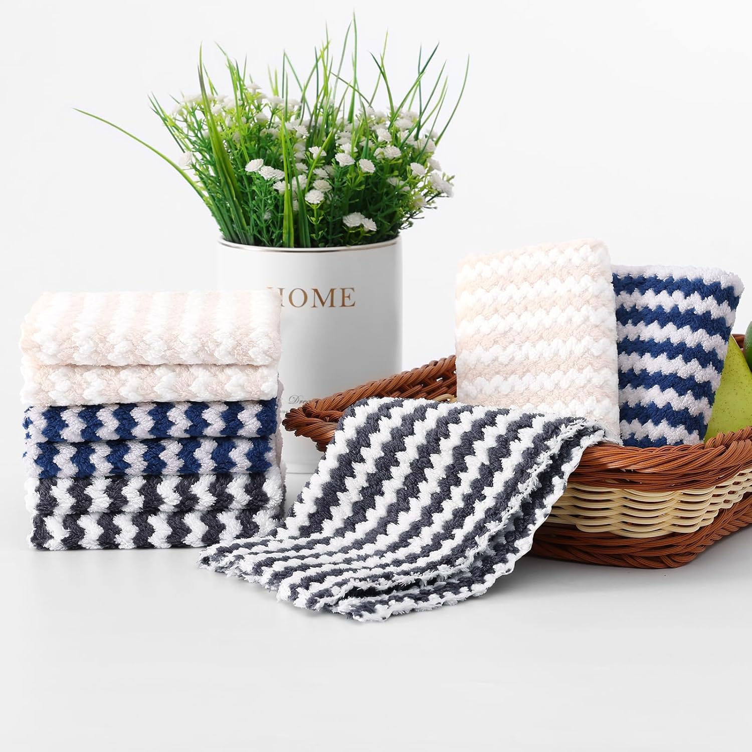 Homaxy 12 Pack Kitchen Dish Cloths, Ultra Soft and Absorbent Dish Towels, Reusable Fast Drying Microfiber Cleaning Cloth, Coral Velvet Wave Design No-lint, 10 x 10 inches, Dark Grey/Navy Blue/Beige