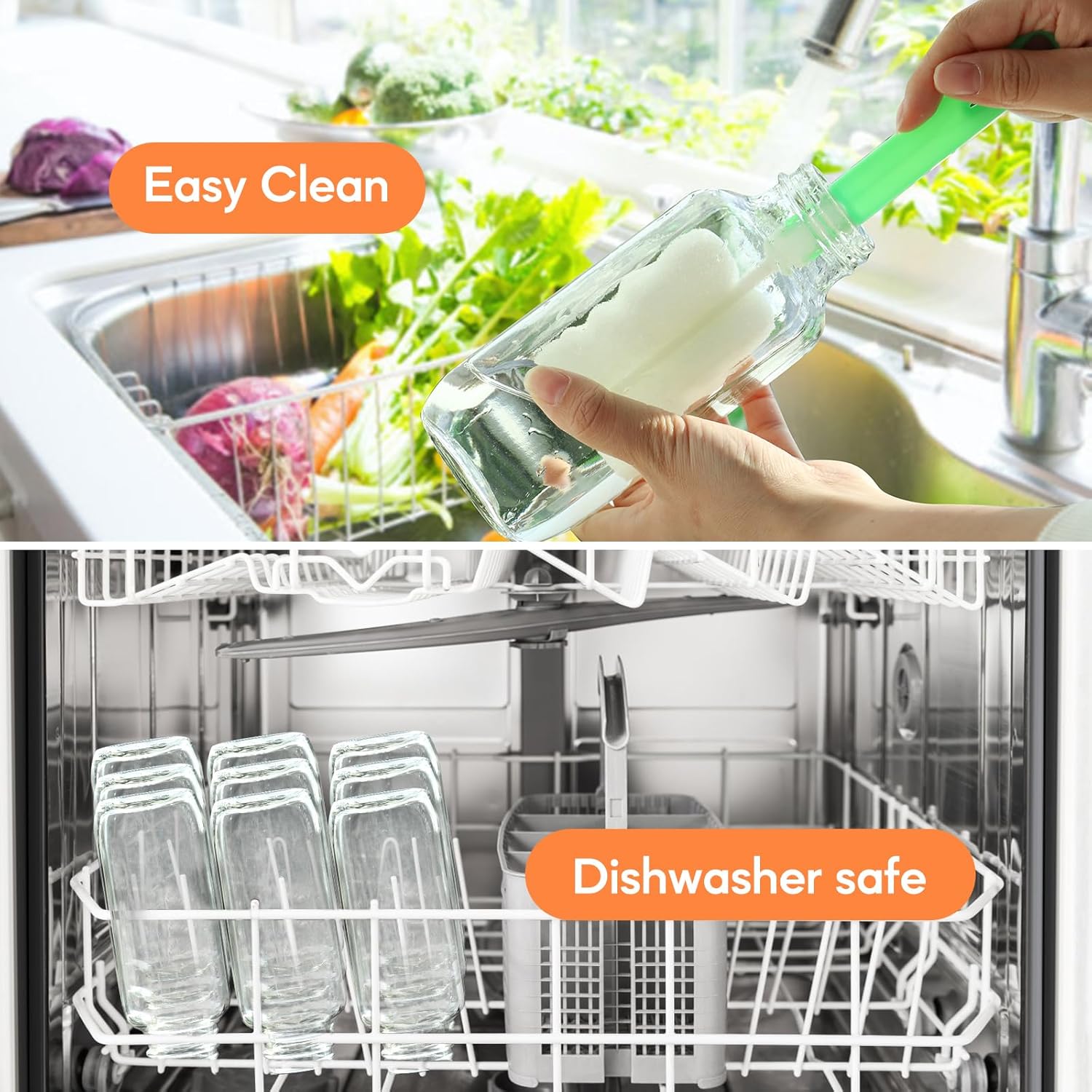 - Effortless Maintenance: Top-rack dishwasher safe; soft sponge brush effortlessly cleans square bottle corners with contoured design; flexible material conforms to angles for quick residue removal; gentle on glass with no scratching risk