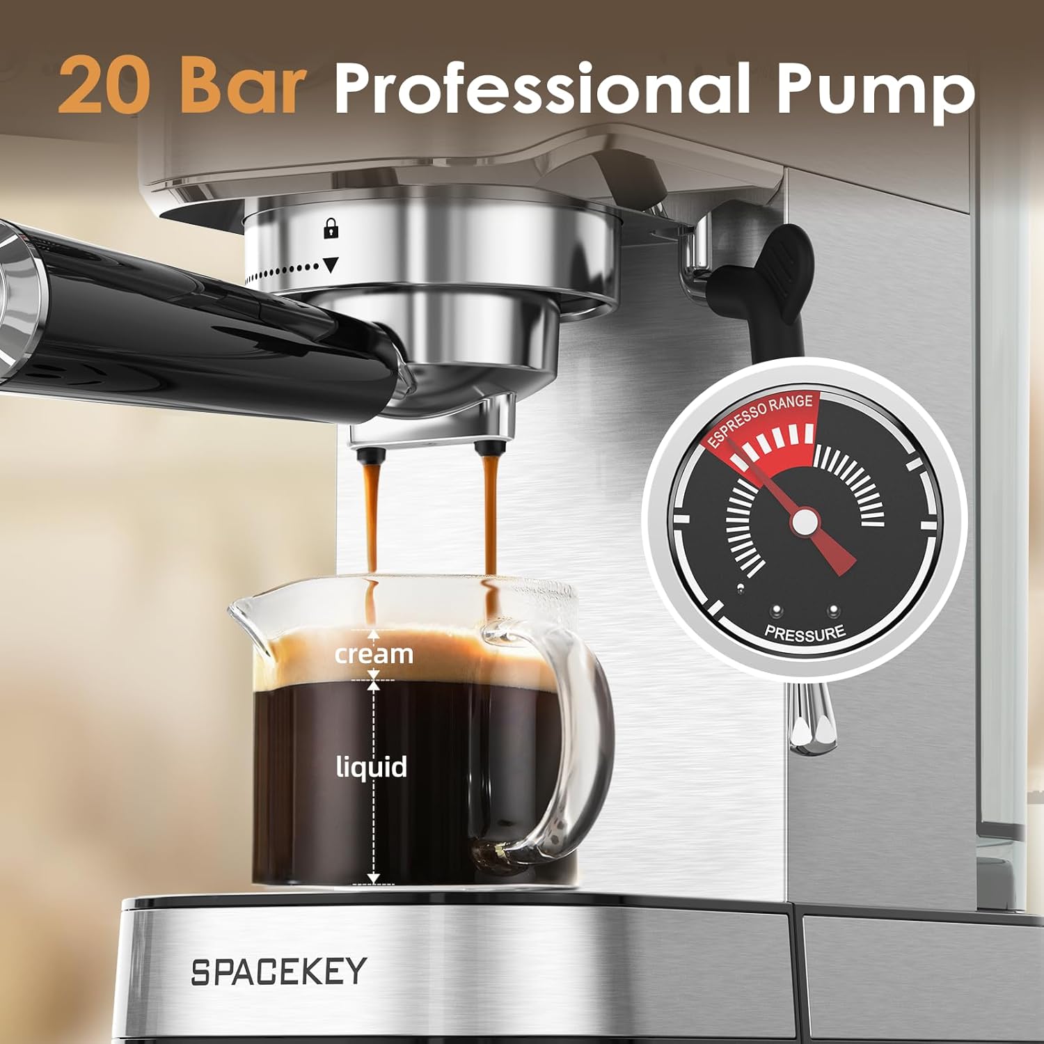 - [20 BAR PRESSURE SYSTEM] Equipped with 20 bar professional pump, SPACEKEY espresso machine can extract the oils in the coffee powder more deeply, bringing a more aromatic and rich smell. Smart pre-soak system can make the coffee powder evenly moist and the flavor extraction better. And the PID intelligently controls water temperature to make your espresso more delicious.