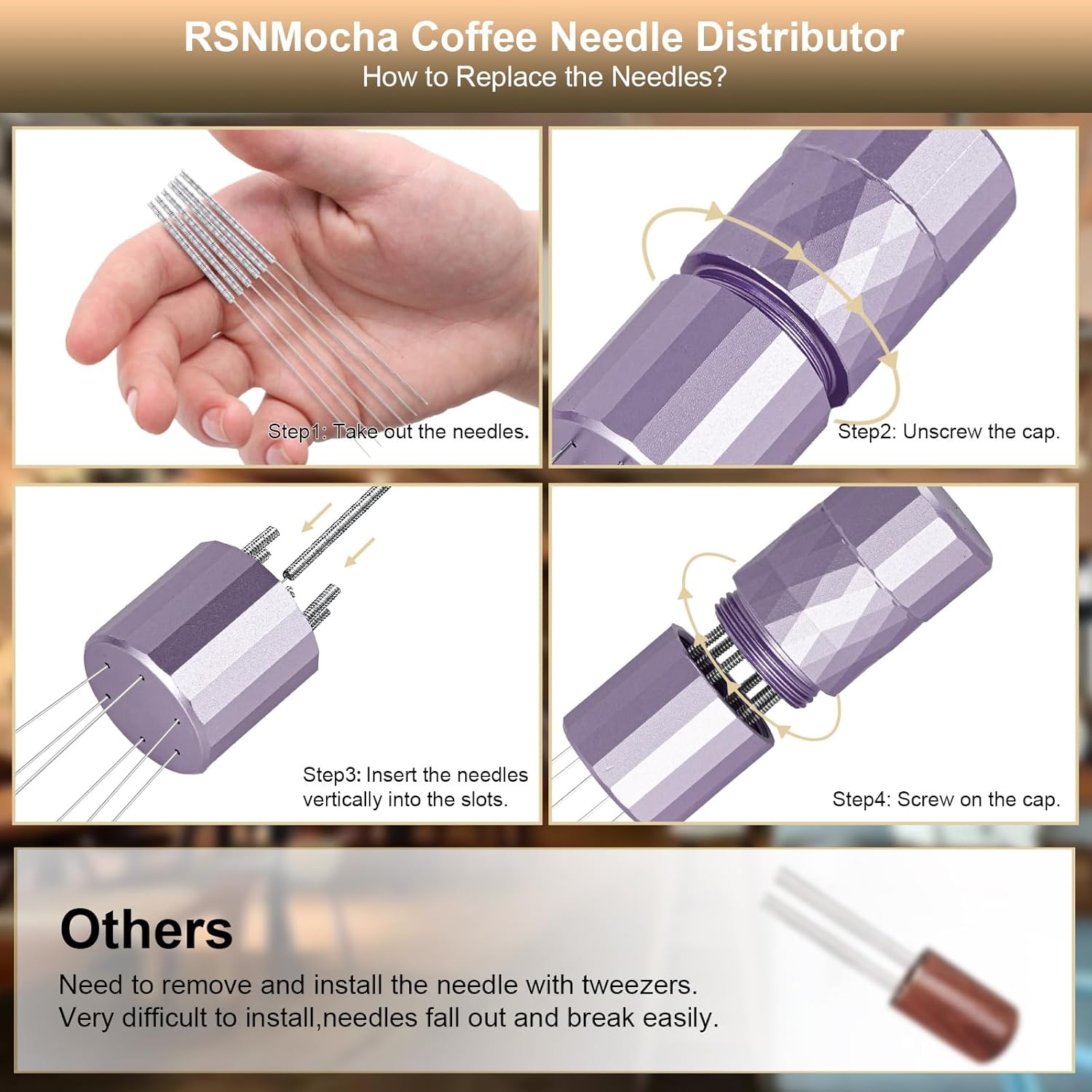 - 【Safe & High-Quality Material】RSNMocha WDT tool for espresso machine accessories is plastic free and made of food-grade 304 stainless steel,6* Φ0.25mm needles, the ideal size to break coffee clumps,it is flexible and durable.