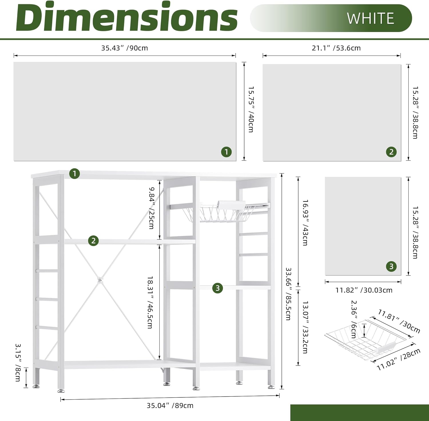 Baker’s Rack, Microwave Oven Stand with Bamboo Frame, 35.43" Coffee Bar with Wire Basket & 6 Hooks, 3-Tier Kitchen Storage Shelf Stand for Kitchen, Living Room, Office, White
