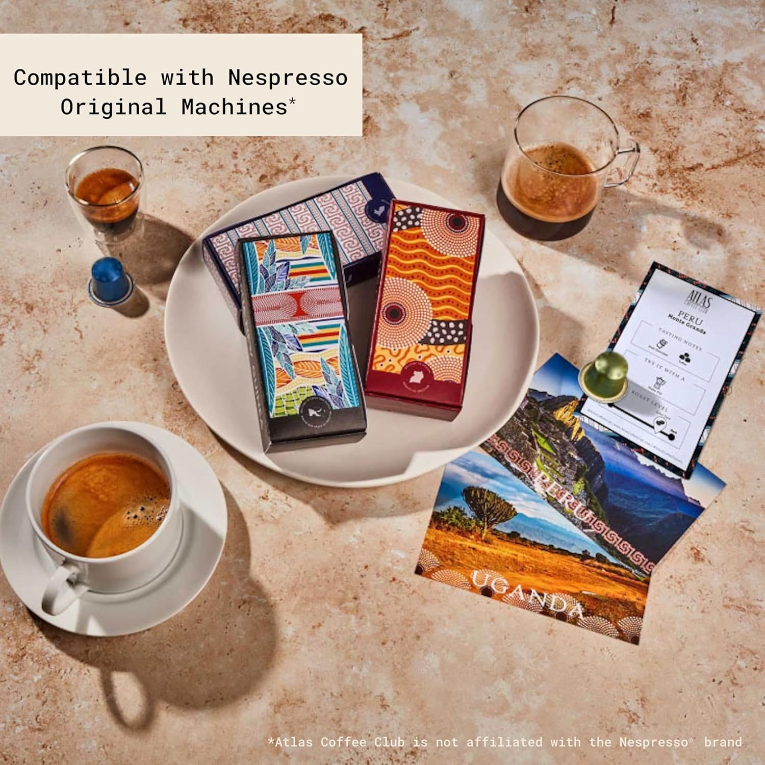 - ENJOY: 10 Atlas Coffee Club espresso capsules (1 box). Compatible with: Nespresso Original Machines*, Essenza Mini, Essenza Plus, Pixie, CitiZ, Lattissima, KitchenAid, and Creatista Nespresso Original machines.* Not compatible with Nespresso Vertuo machines. *Atlas Coffee Club is not affiliated with the Nespresso brand.