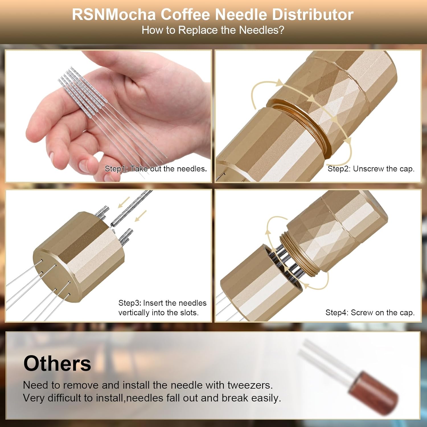 - 【Safe & High-Quality Material】RSNMocha WDT tool for espresso machine accessories is plastic free and made of food-grade 304 stainless steel,6* Φ0.25mm needles, the ideal size to break coffee clumps,it is flexible and durable.