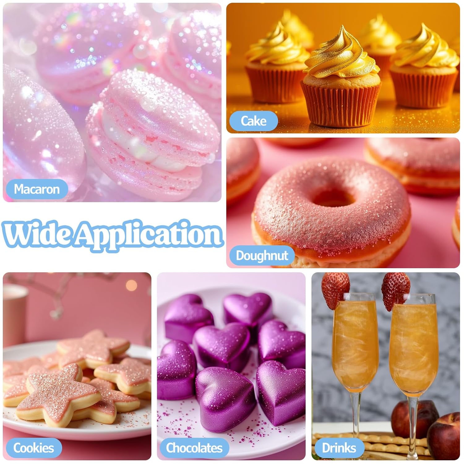 - Safe & Non-Toxic -100% edible food-grade glitter powder in 0.28 oz/8 g. Our edible glitter is made from food-grade ingredients that is vegan-friendly, gluten-free, dairy-free, non-GMO, it will not alter the original taste or texture of beverages and foods. so everyone can use and enjoy this product regardless of diet or food allergies
