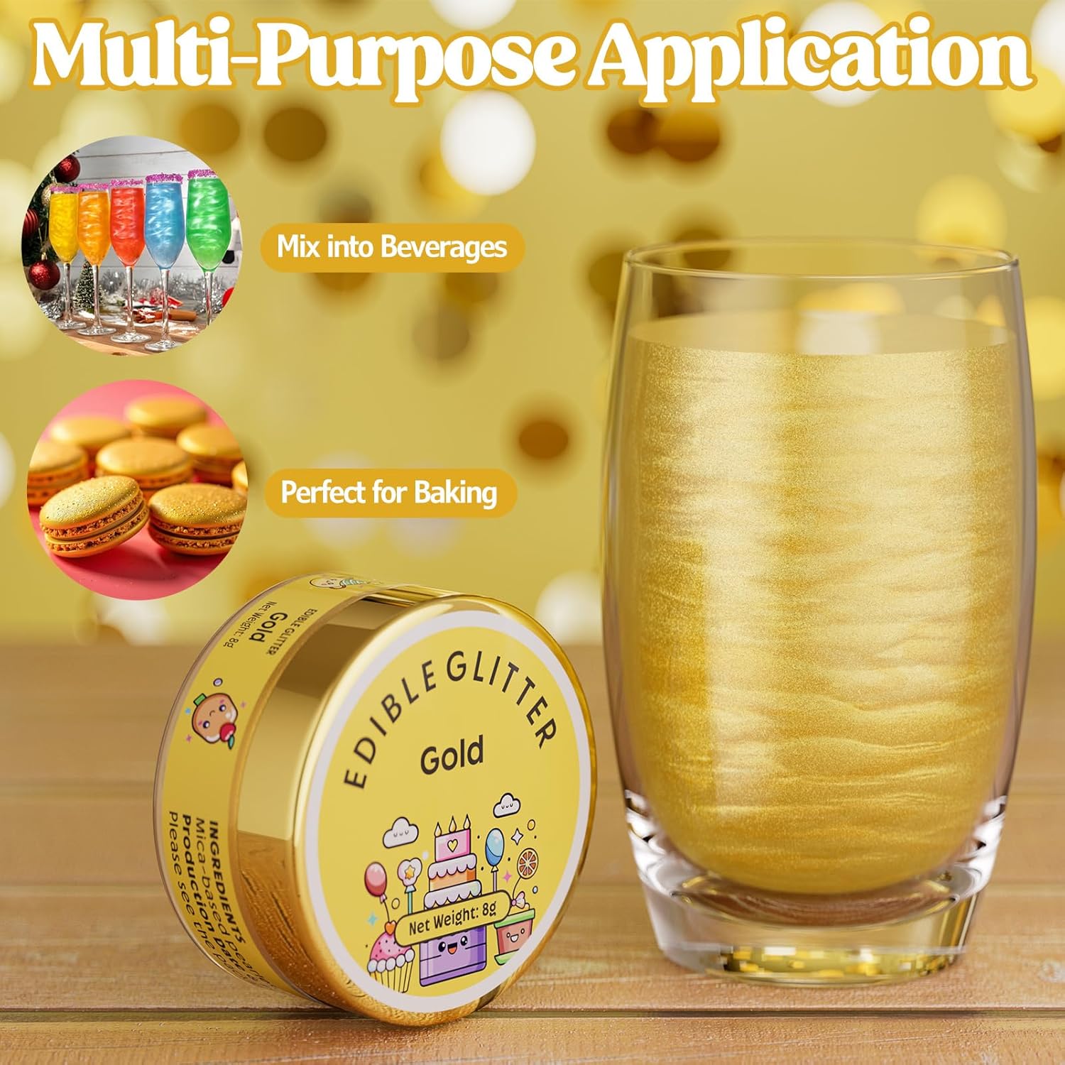 - Safe & Non-Toxic -100% edible food-grade glitter powder in 0.28 oz/8 g. Our edible glitter is made from food-grade ingredients that is vegan-friendly, gluten-free, dairy-free, non-GMO, it will not alter the original taste or texture of beverages and foods. so everyone can use and enjoy this product regardless of diet or food allergies