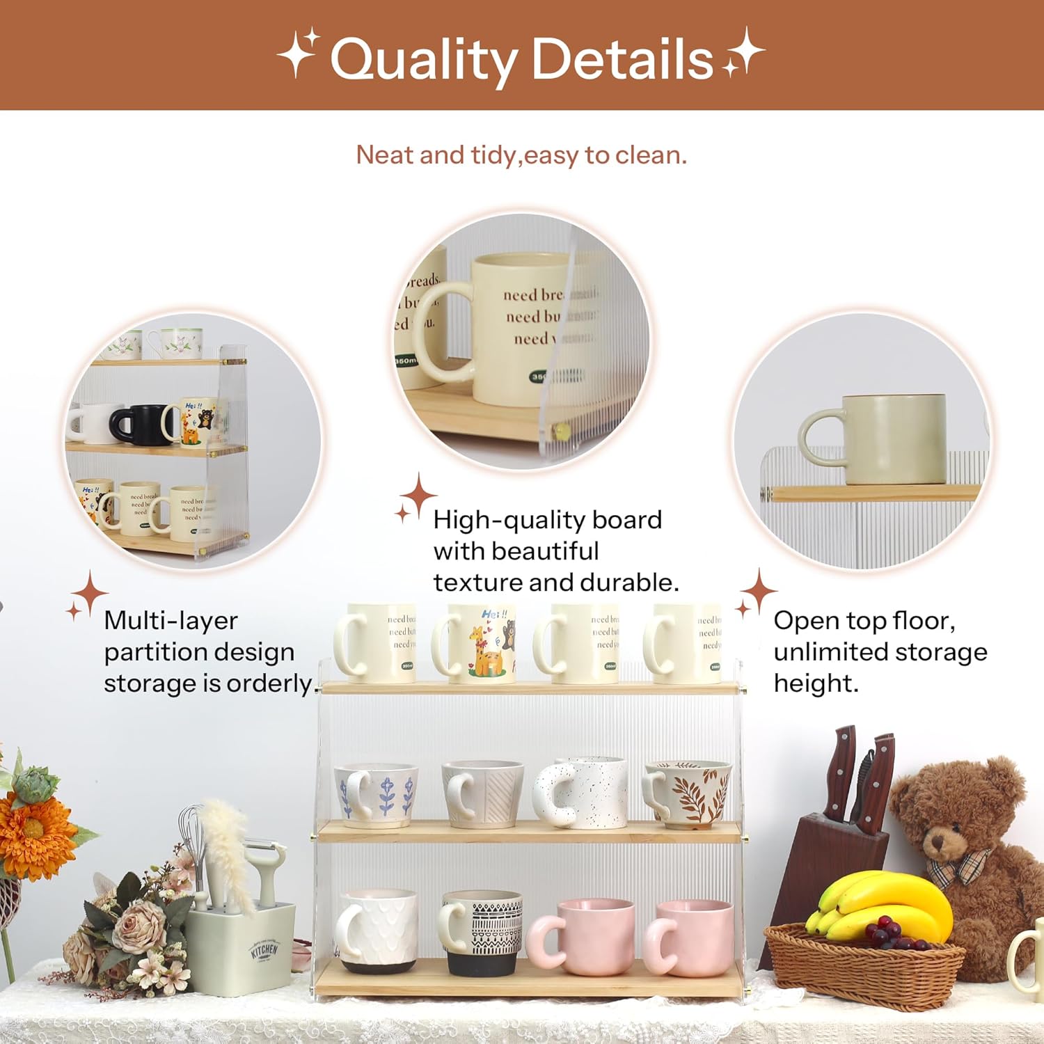 - Stylish Design: Featuring wavy acrylic side panels and a natural wood board. The sturdy construction ensures that it can hold the weight of multiple mugs without wobbling or tipping. this organizer presents an aesthetically pleasing texture, ideal for coffee bar enthusiasts and those who love to decorate their spaces.