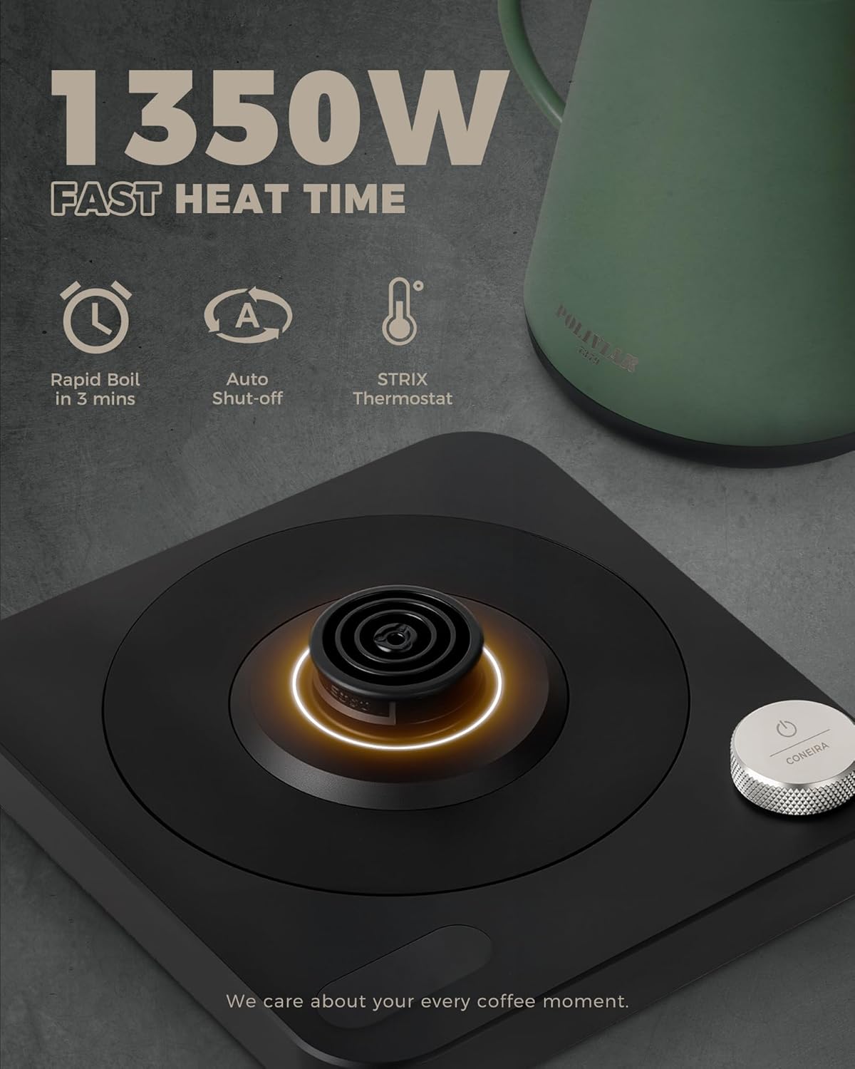 - FAST BOIL TECHNOLOGY: The electric water kettle boils water in just 3 minutes with a powerful 1350W heating element. The electric kettle features an automatic shut-off for safety when the water reaches boiling or when the kettle is empty.