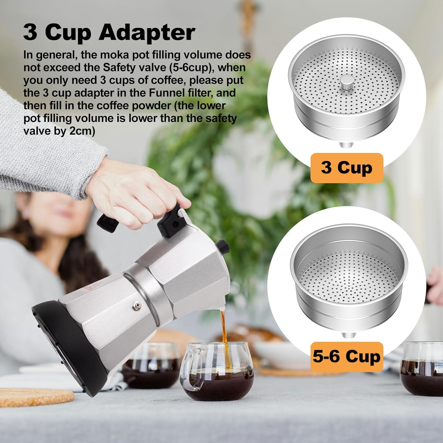 - 5-6 Cup Capacity: 5-6 cups large capacity to meet your needs. Meanwhile, we also have 3 cup adapter, when you only need 3 cups capacity, just put the 3 cup adapter into the Funnel filter first, then fill it with coffee powder, so you can have 3 cups capacity