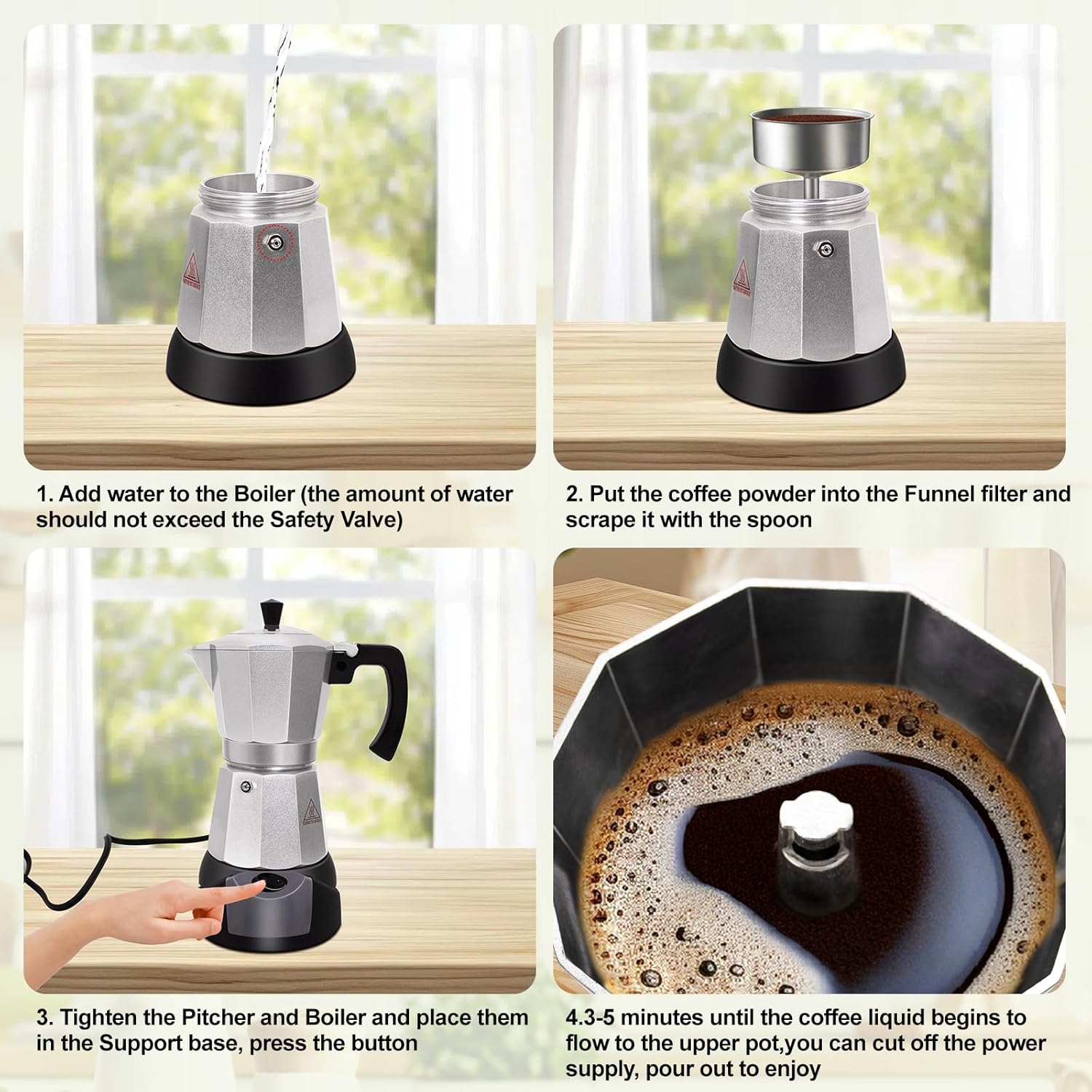 - Electric Moka Pot for Efficient Brewing: Experience the convenience of our electric 5-6 Cup moka pot. Simply fill, plug in, and press start for authentic Italian coffee in minutes. Our moka pot brings the rich aroma of espresso to your home effortlessly(110V)