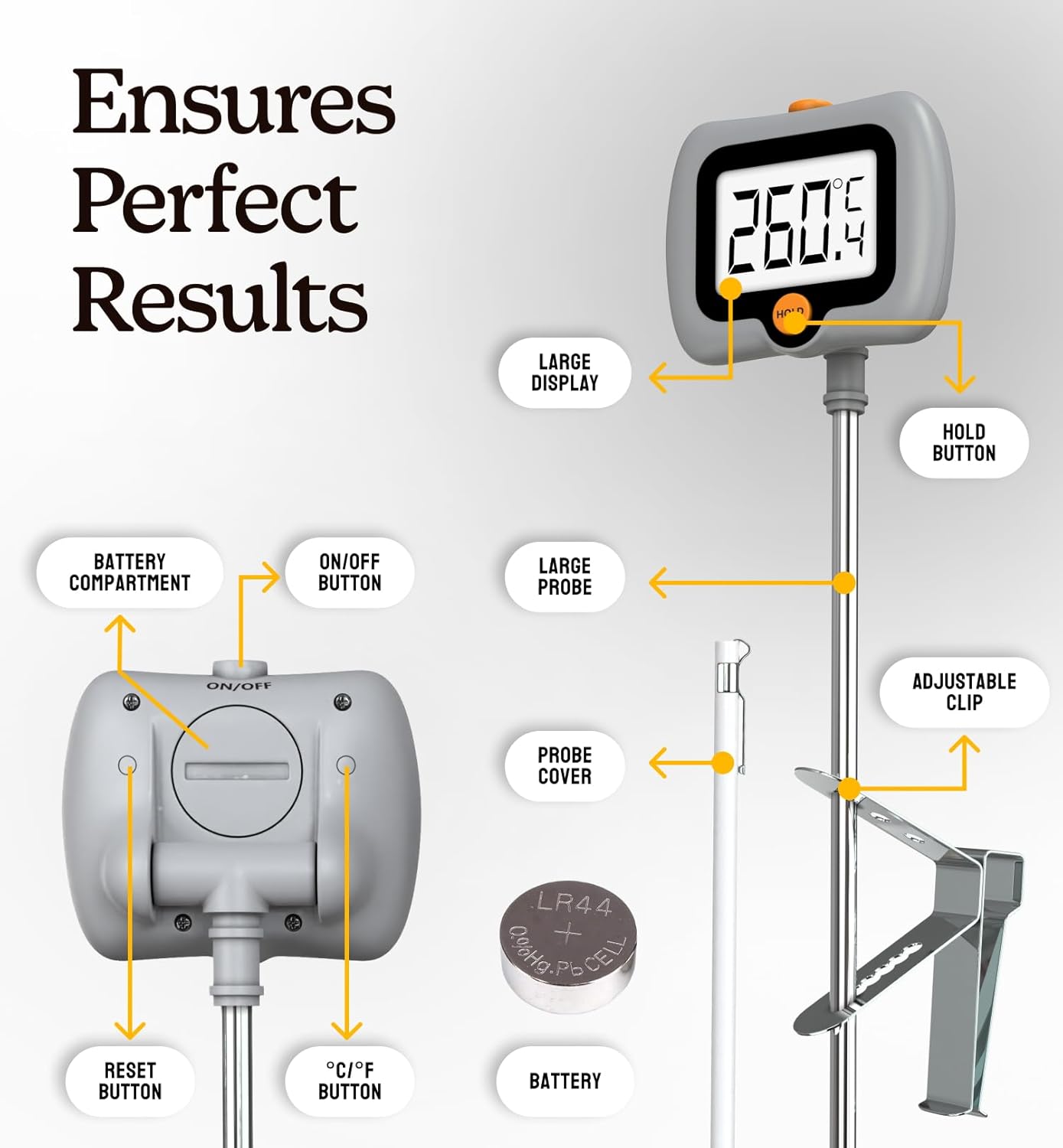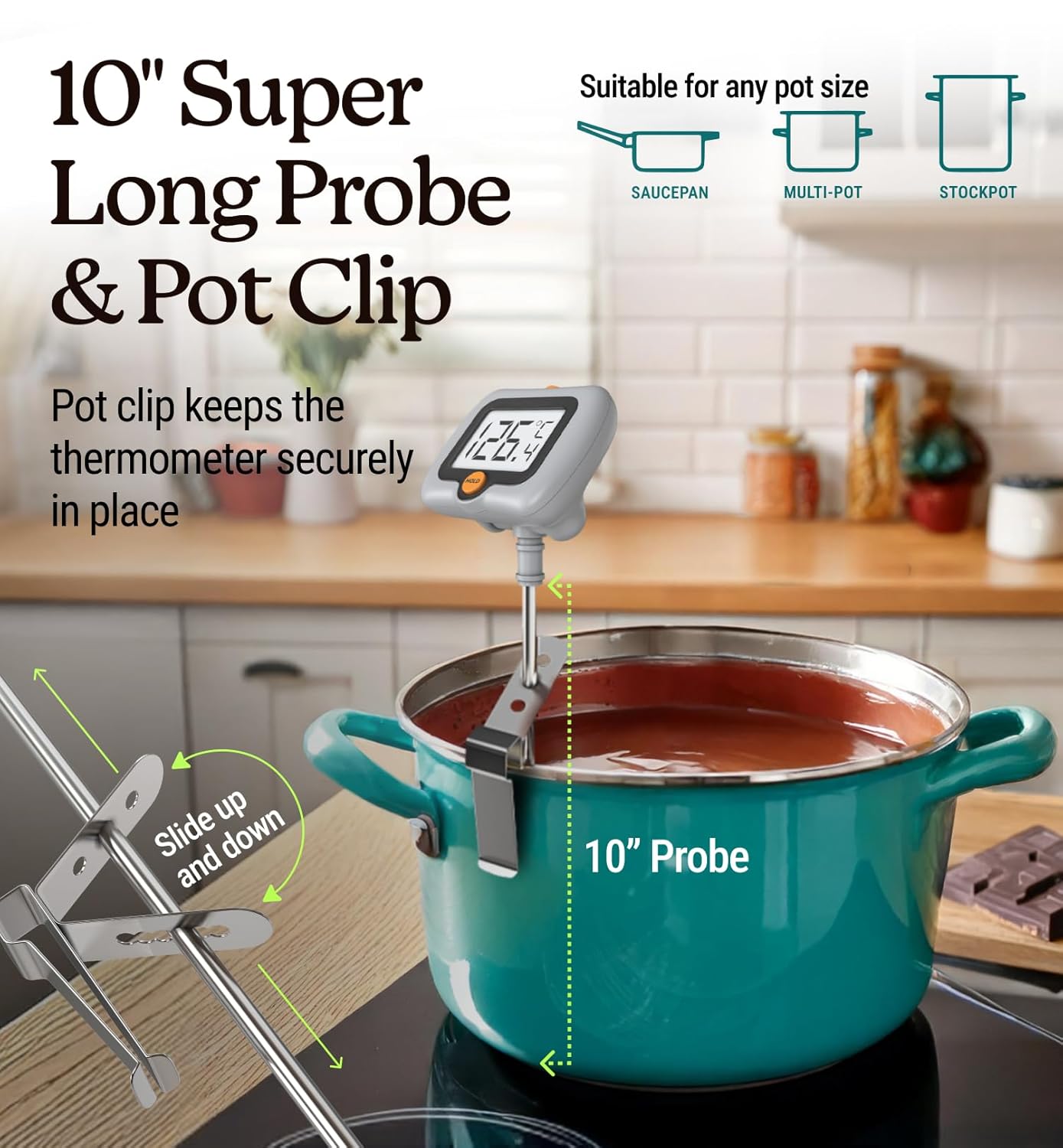 - Pot Clip Design for Safer Operation: This candy thermometer digital with a clip can be fixed to the pot so you can free your hands to focus on the cooking, and protect your hands from the hot