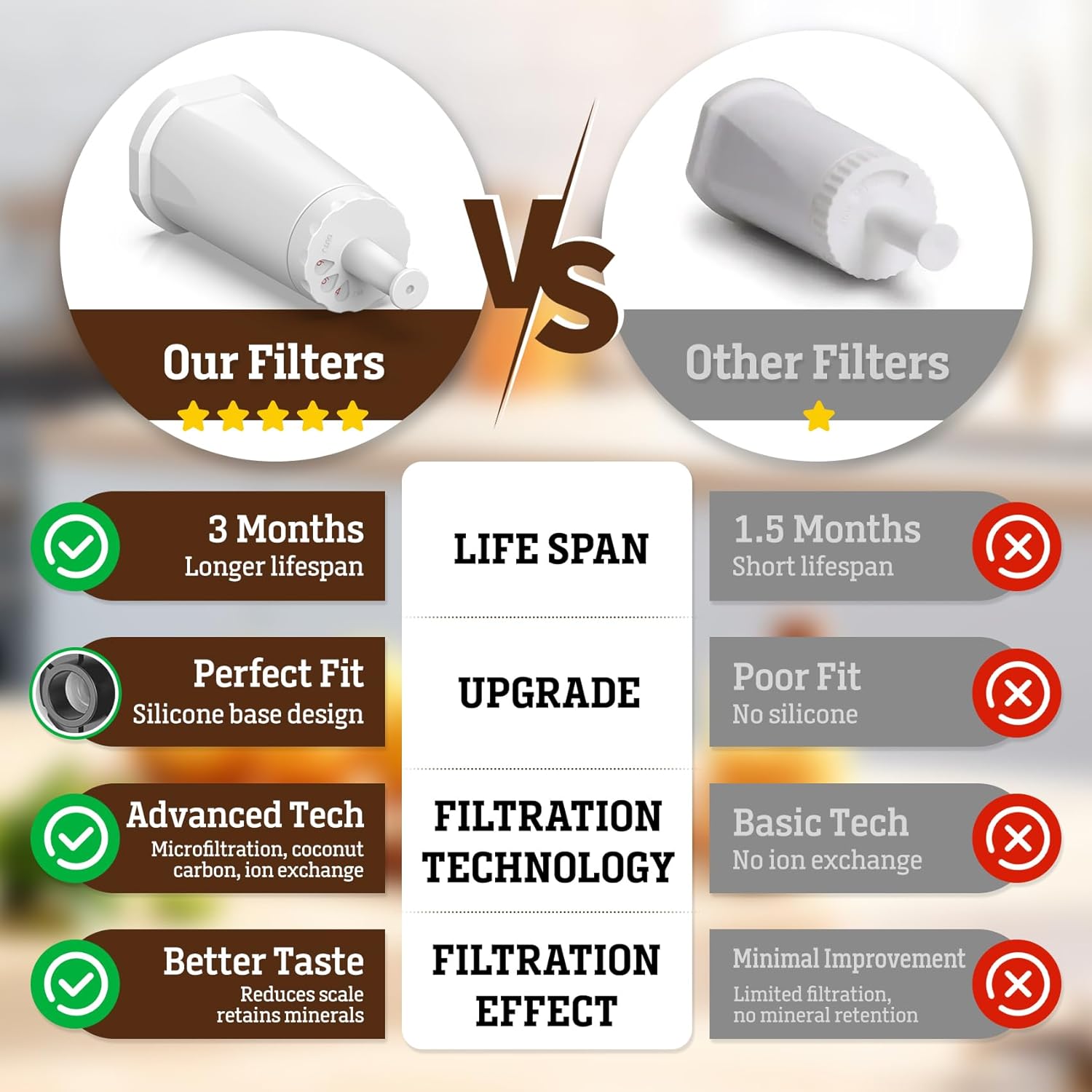 - QUICK & EASY INSTALLATION - Replace your filter with ease in just a few minutes. Simply soak the filter in fresh water for 5 minutes, insert it into the filter holder, and place it in the water tank. Enjoy hassle-free maintenance and focus more on brewing the perfect cup of coffee.