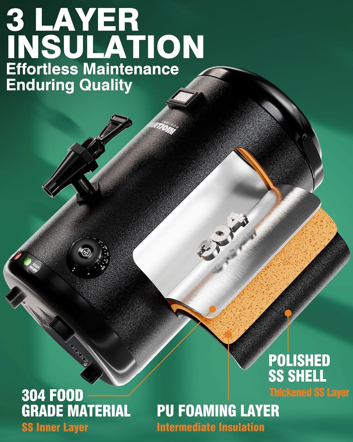 - OUTSTANDING INSULATION: Featuring electric heating, this double walled stainless steel electric beverage dispenser maintains your drinks at set temperatures for long periods. With its polyurethane insulation and double-layered lid, even without power, heat loss is minimized, ensuring your coffee, tea, and hot chocolate keep perfectly warm or cold.