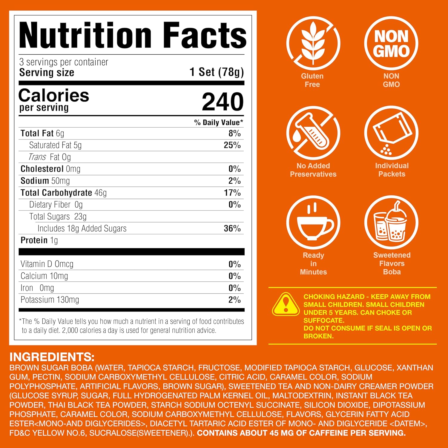 - WHAT IS INSIDE - 3 Individually wrapped portions of Brown Sugar boba, 3 thai milk tea packets, & 3 extra wide paper straws. Store in a cool, dry place (no refrigeration necessary).