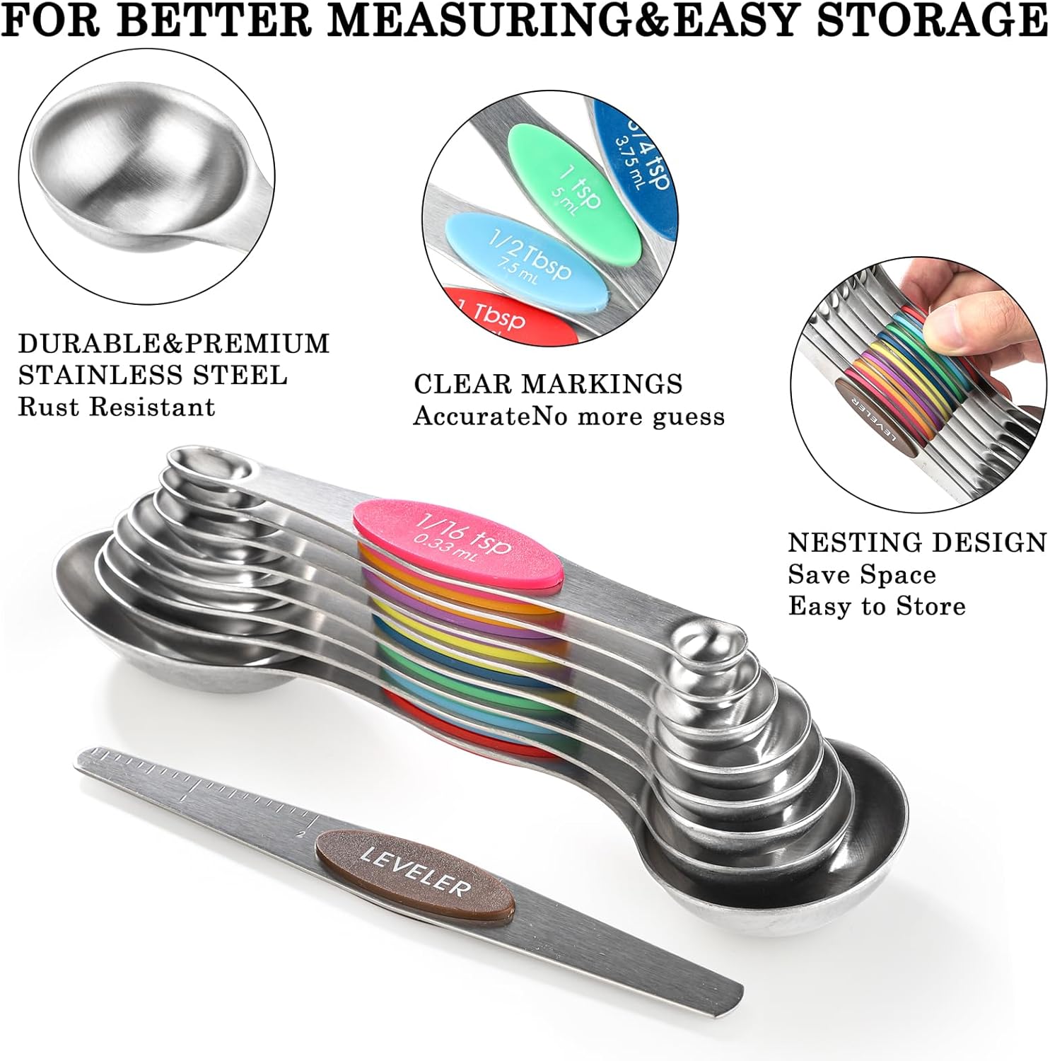 - 【Magnetic Measuring Cups and Spoons Set】This stainless steel heavy duty magnetic measuring cups and spoons set includes 8 magnetic measuring Cups set (1/16 cup,1/8 cup, 1/4 cup, 1/3 cup, 1/2 cup, 2/3 cup, 3/4 cup, 1 cup), 8 magnetic measuring Spoons set (1/16 tsp,1/8 tsp, 1/4 tsp, 1/2 tsp, 3/4 tsp, 1 tsp, 2 tsp, 1 tbsp), 1 Leveler, various sizes meet all your baking needs.