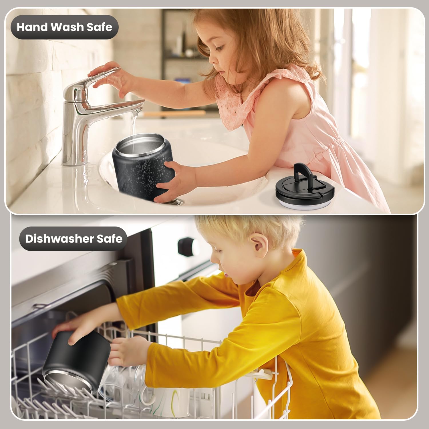 - New Buckle of Lid: The food containers feature a press-seal construction, allowing you to simply pull the handle upwards to 90° to open the lid/ 90° downward closure. This design is maintaining vacuum no need to rotate the lid open . Additionally, the container comes equipped with a carrying handle, making it convenient for your child to carry it. Whether at school, an outdoor outing, or a family gathering, this user-friendly design empowers children to confidently enjoy their delicious meals.
