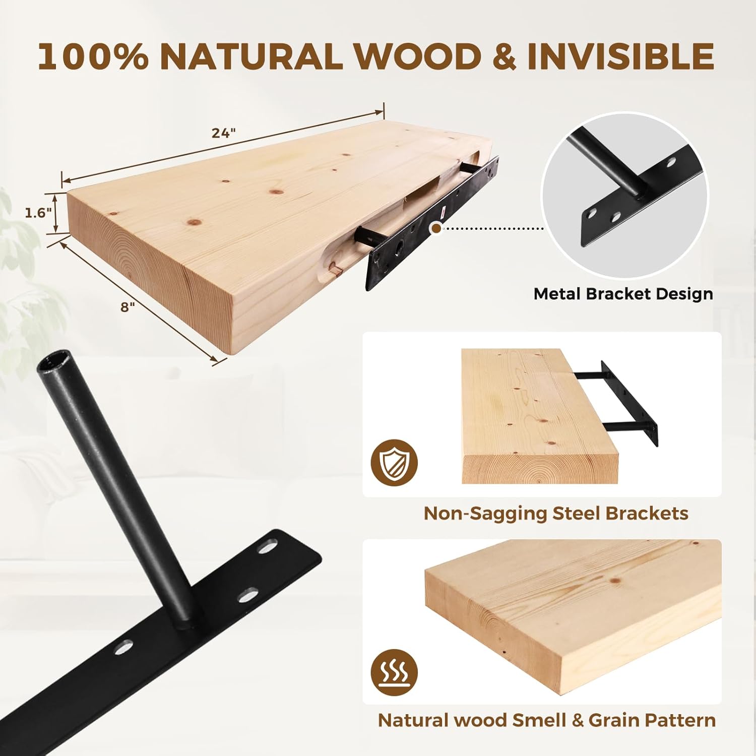 - Extra-Wide & Strong Build: With a wider 8-inch depth and solid wood thickness, this wall-mounted floating shelf holds more with ease—no bending or sagging under weight