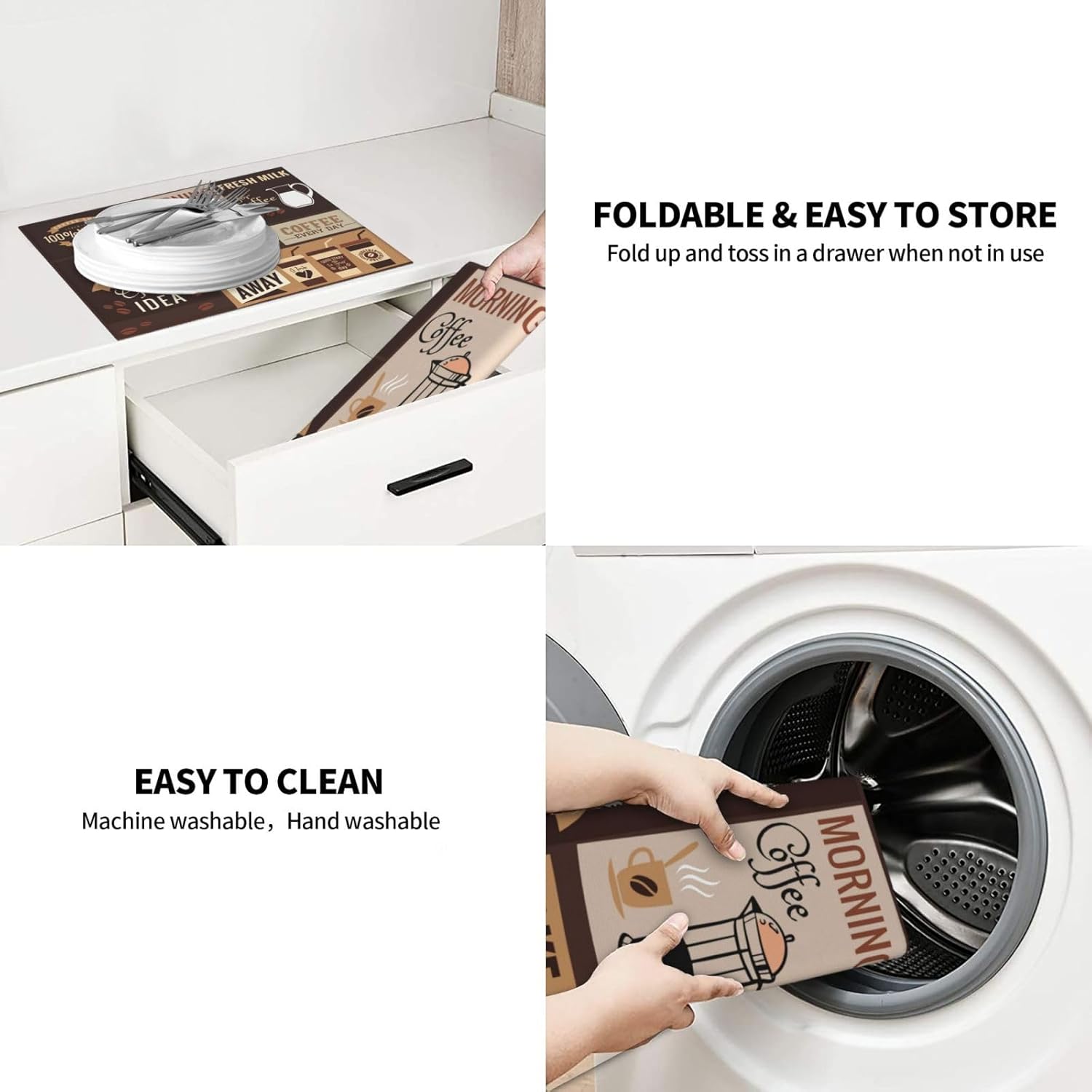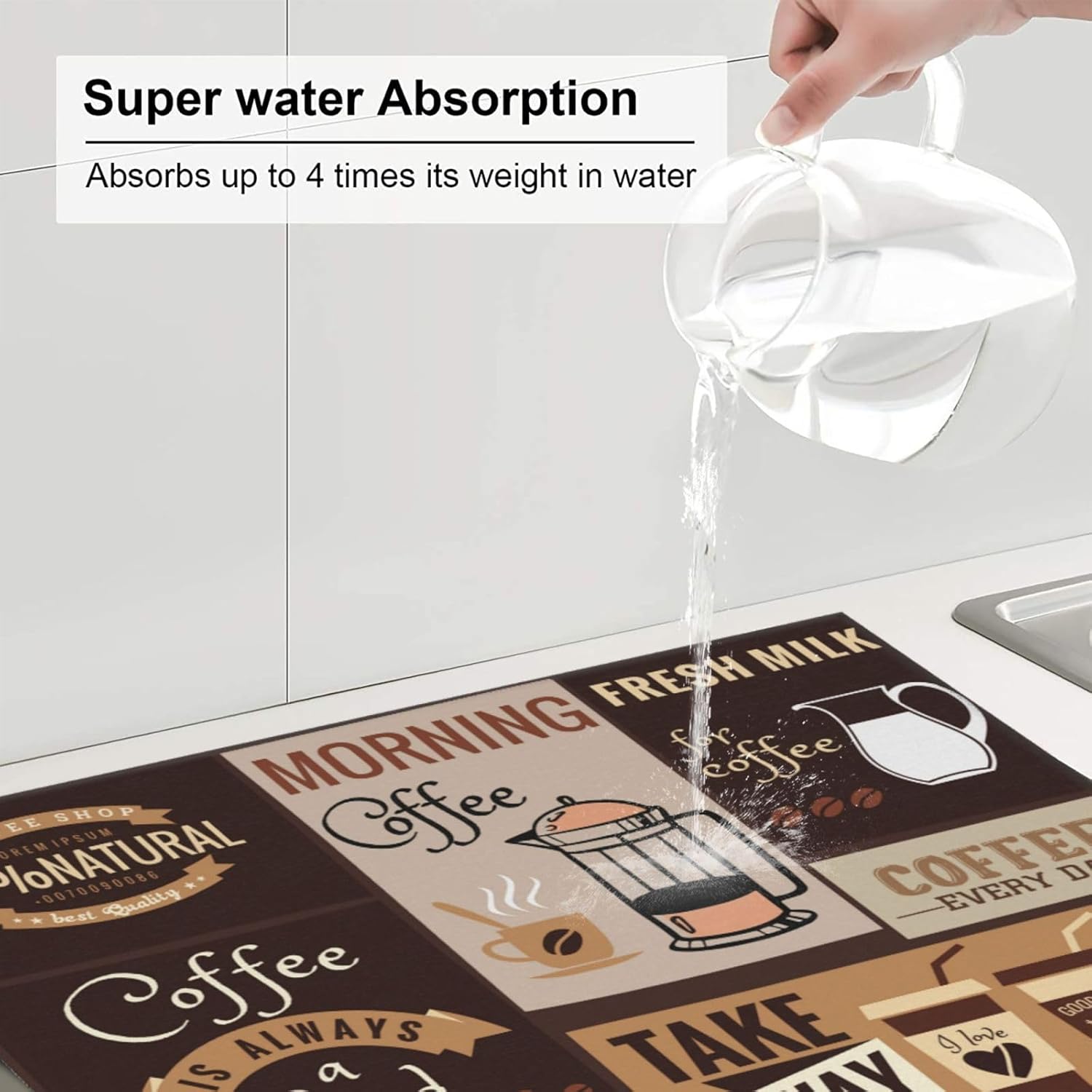 Retro Coffee Pattern Dish Drying Mat, Highly Absorbent Microfiber Kitchen Counter Pad Reusable Washable, 16*18"