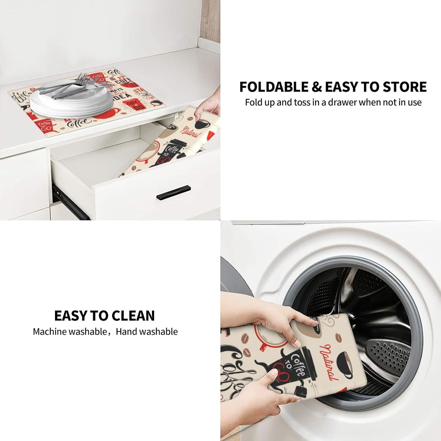 - Easy To Clean & Store -- The Drying Mat Is Machine Washable, Easy To Clean And Store. Fold And Slip Into A Drawer Or Cabinet When Not In Use. The Mat Can Also Be Hung On The Hook With The Tape
