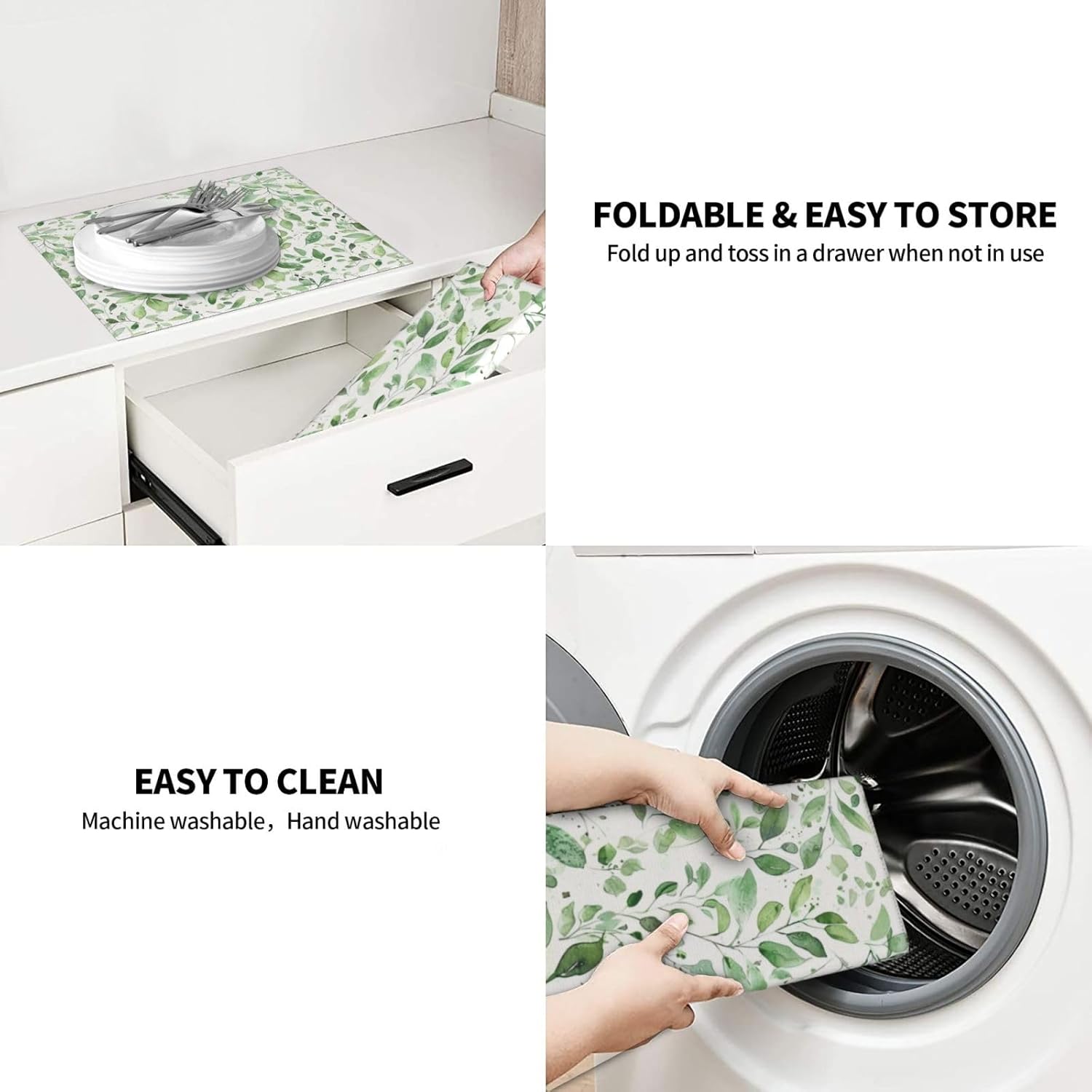 Green Leaves Dish Drying Mat, Highly Absorbent Microfiber Kitchen Counter Pad Reusable Washable, 16*18"
