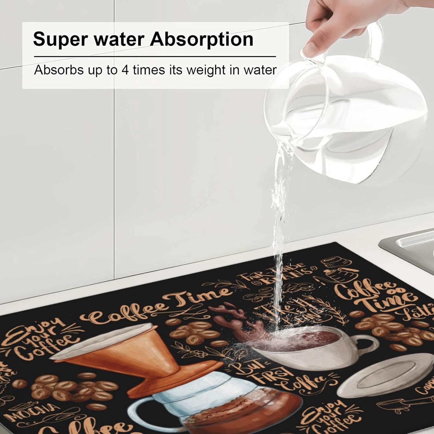 - Size -- 18x24inch/45.7x60.9cm. Different Design On 2 Sides, One Side Can Suck Moisture With Aesthetics Pattern, Another One Gray Non-Slip Side. It Is A Versatile Addition To Your Kitchen. Our Coffee Mats Are A Must-Have Accessory For All Coffee Lovers