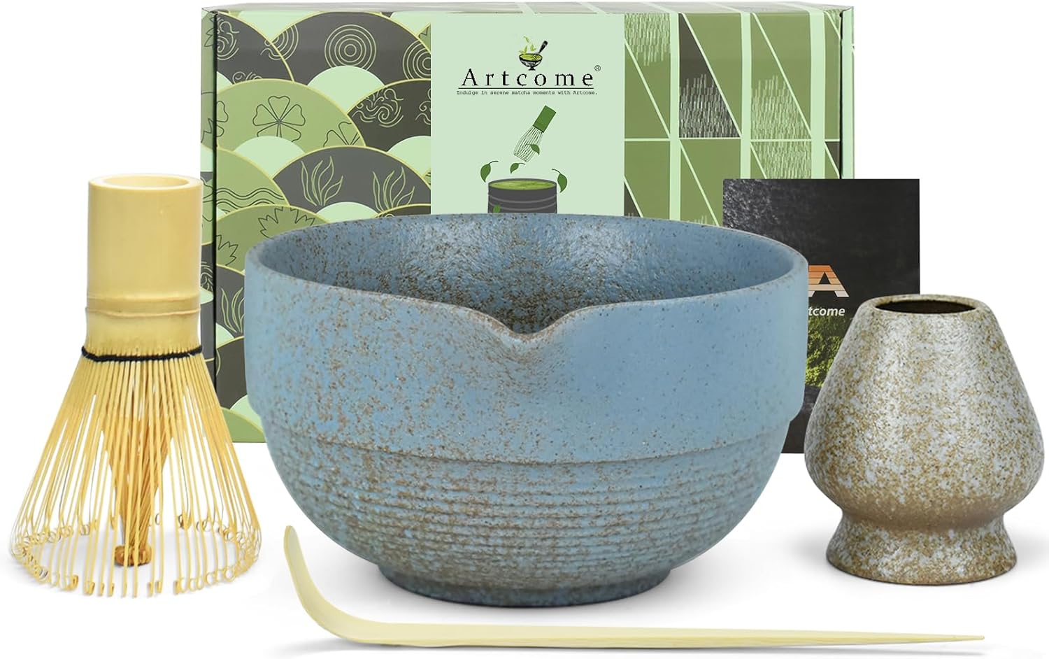 Artcome Premium Matcha Tea Set - 17oz Handcrafted Ceramic Bowl with Blue Reactive Glaze, Bamboo Whisk, Scoop, Whisk Holder & Brewing Guide - Japanese Tea Ceremony Tools for Perfect Matcha Preparation