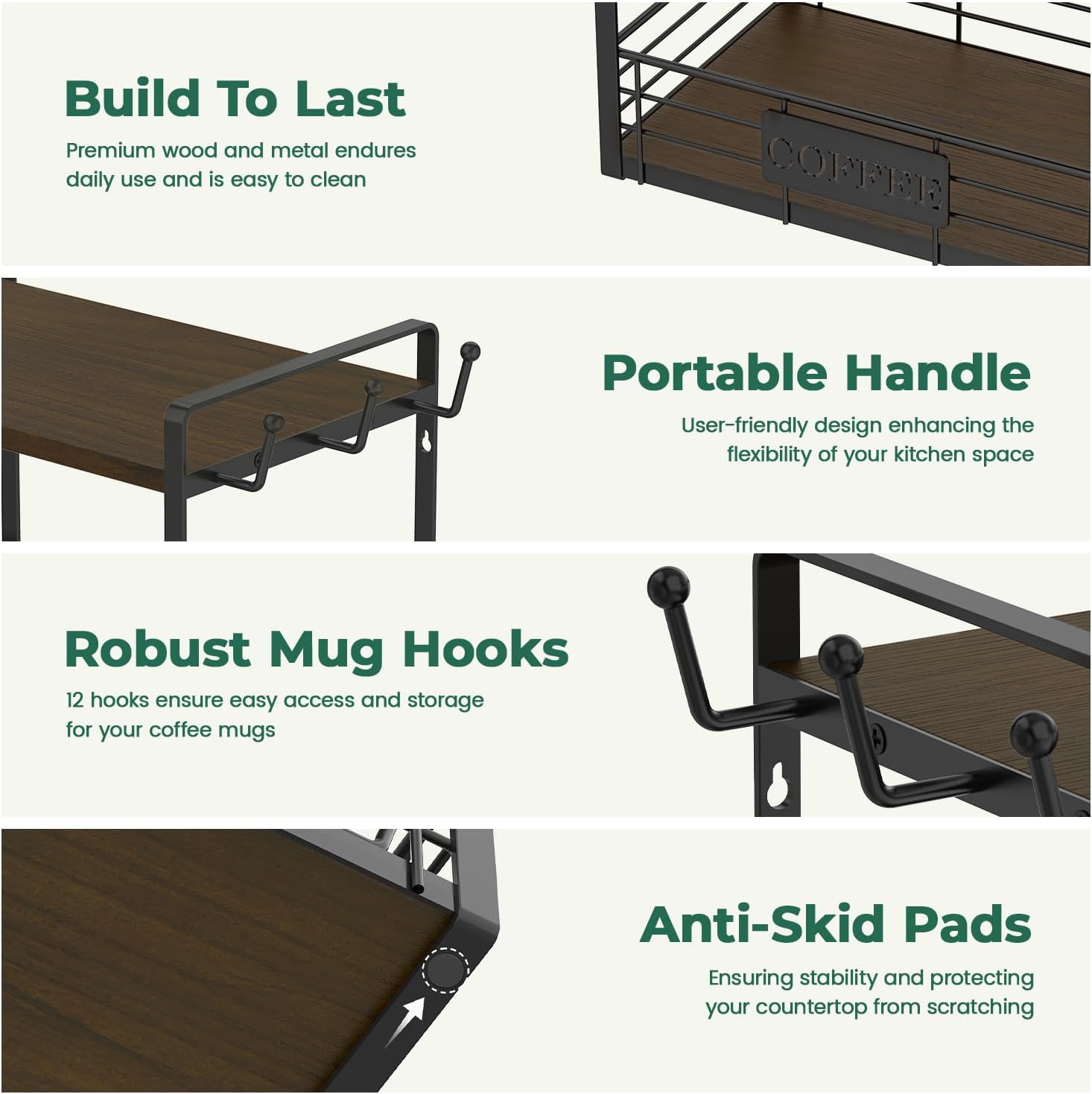 - Spacious Dual-Tier Storage: Transform your home coffee station with EsLuker.ly’s coffee cup holder for countertop, featuring two-tier shelves and 12 mug hooks. This design provides ample space for all your coffee essentials, meeting the storage needs of any family kitchen or office coffee station