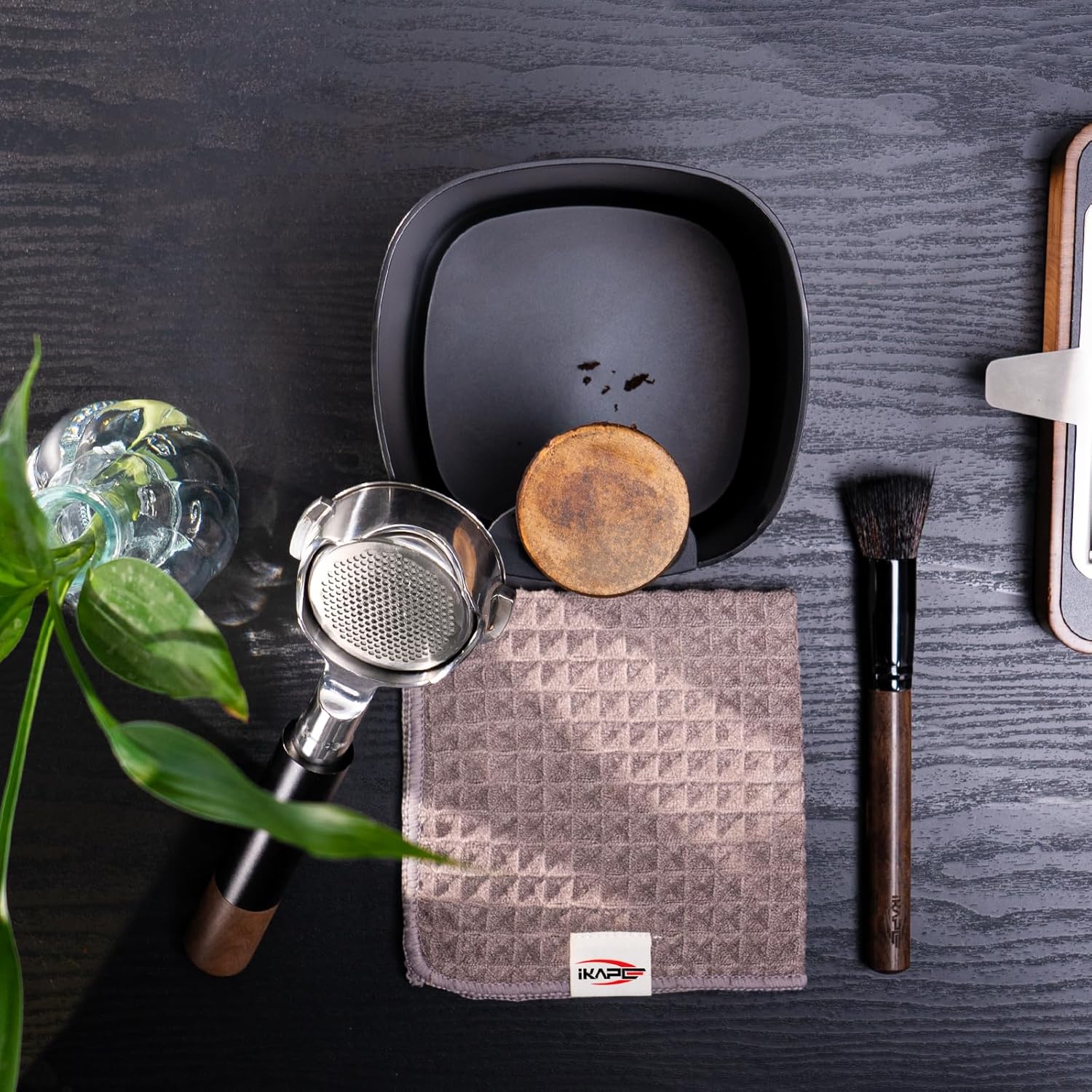 IKAPE Espresso Kit 3 IN 1, Espresso Knock Box, Cleaning Towel & Brush for Barista-Grade Maintenance - Black Espresso Machine Coffee Puck Disposal Box
