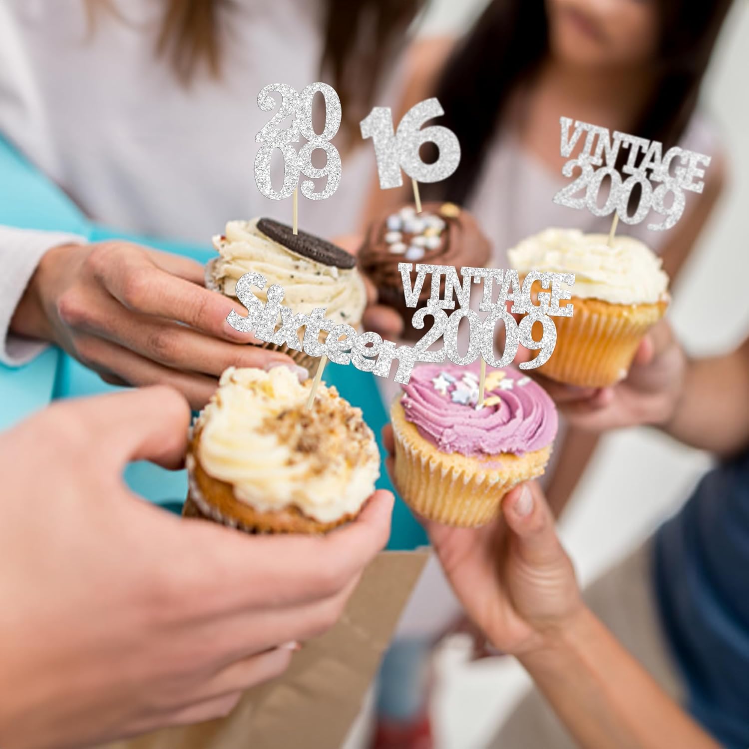 Gyufise 24Pcs 16th Birthday Cupcake Toppers Glitter Sixteen Vintage 2009 Hello 16 Years Birthday Cupcake Picks Sweet 16 Cake Decorations for Happy 16th Birthday Anniversary Party Supplies Silver
