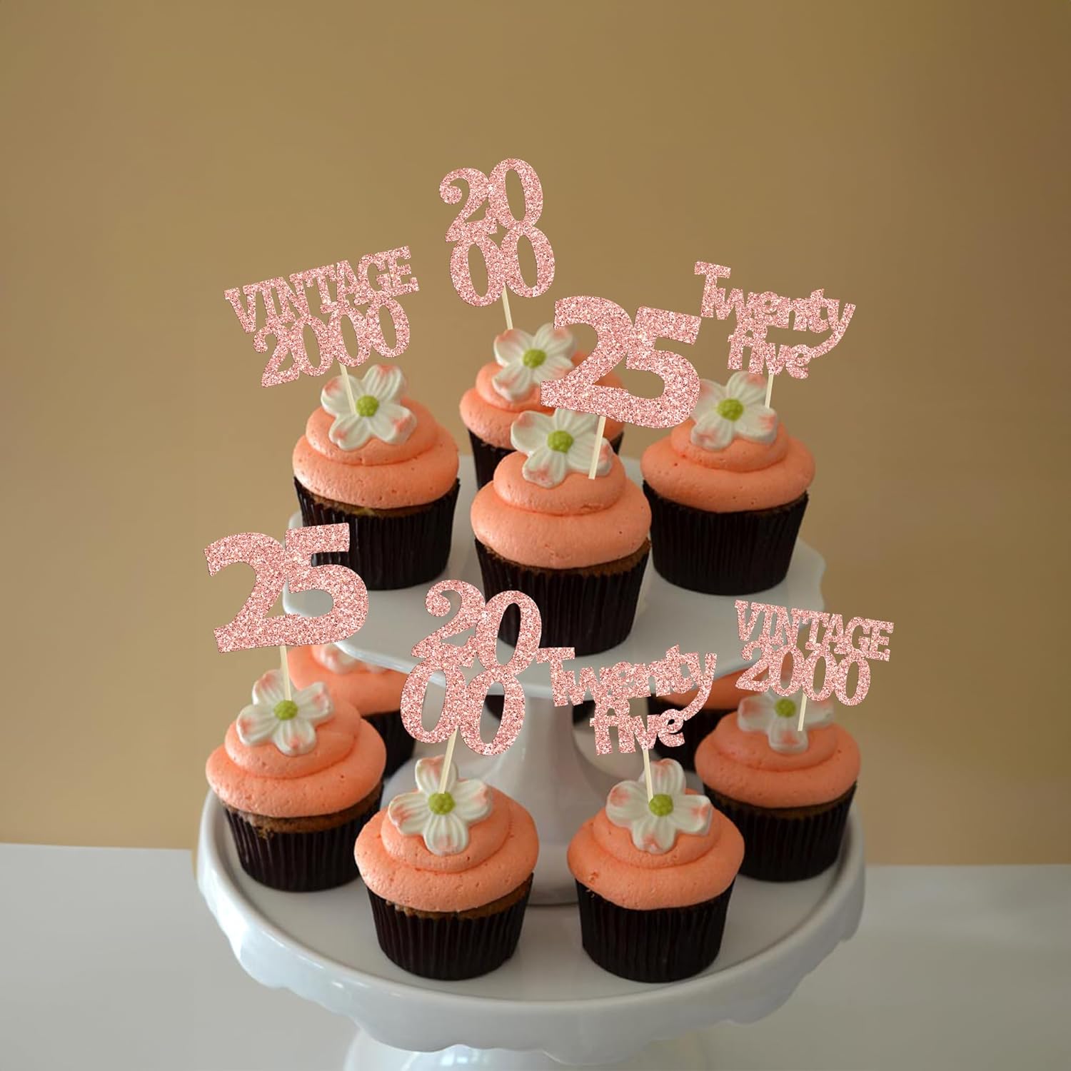 Gyufise 24Pcs 25th Birthday Cupcake Toppers Glitter Twenty-five Vintage 2000 Hello 25 Years Birthday Cupcake Picks Cheers to 25 Cake Decor for Happy 25th Anniversary Party Supplies Rose Gold