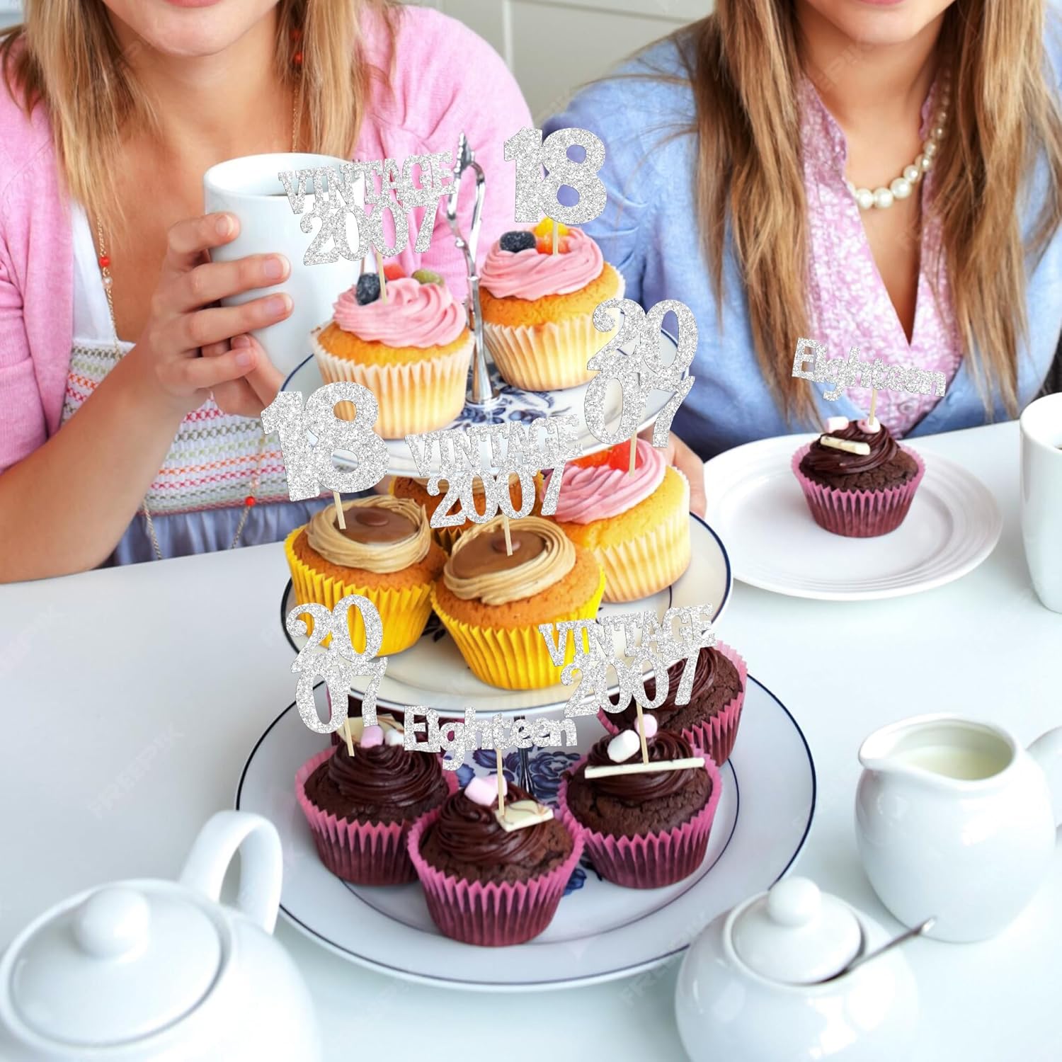 Gyufise 24Pcs 18th Birthday Cupcake Toppers Glitter Eighteen Vintage 2007 Hello 18 Years Birthday Cupcake Picks Adultish 18 Cake Decorations for Happy 18th Birthday Anniversary Party Supplies Silver