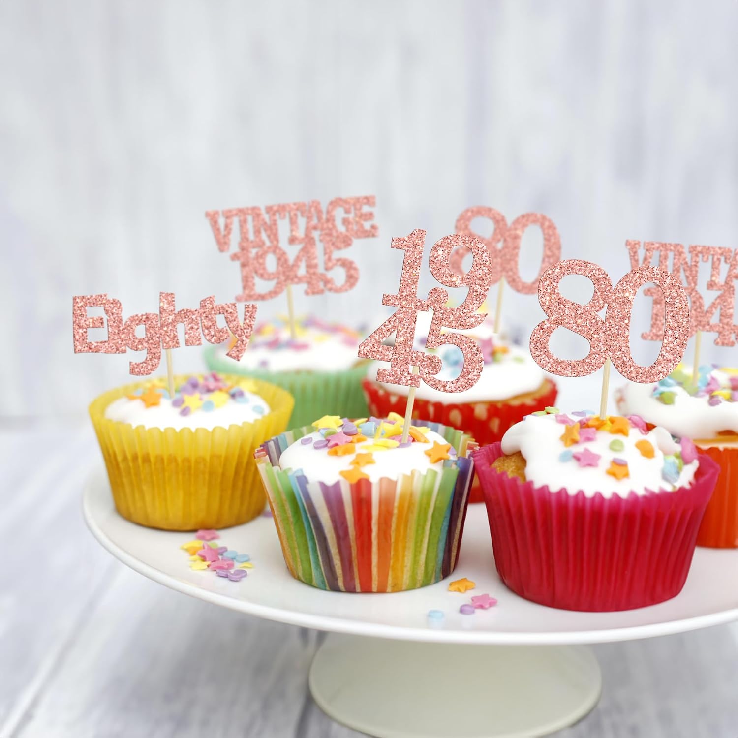 Gyufise 24Pcs 80th Birthday Cupcake Toppers Glitter Cheers to 80 Fabulous Eighty Vintage 1945 Cupcake Picks 80th Birthday Wedding Anniversary Party Cake Decorations Supplies Rose Gold