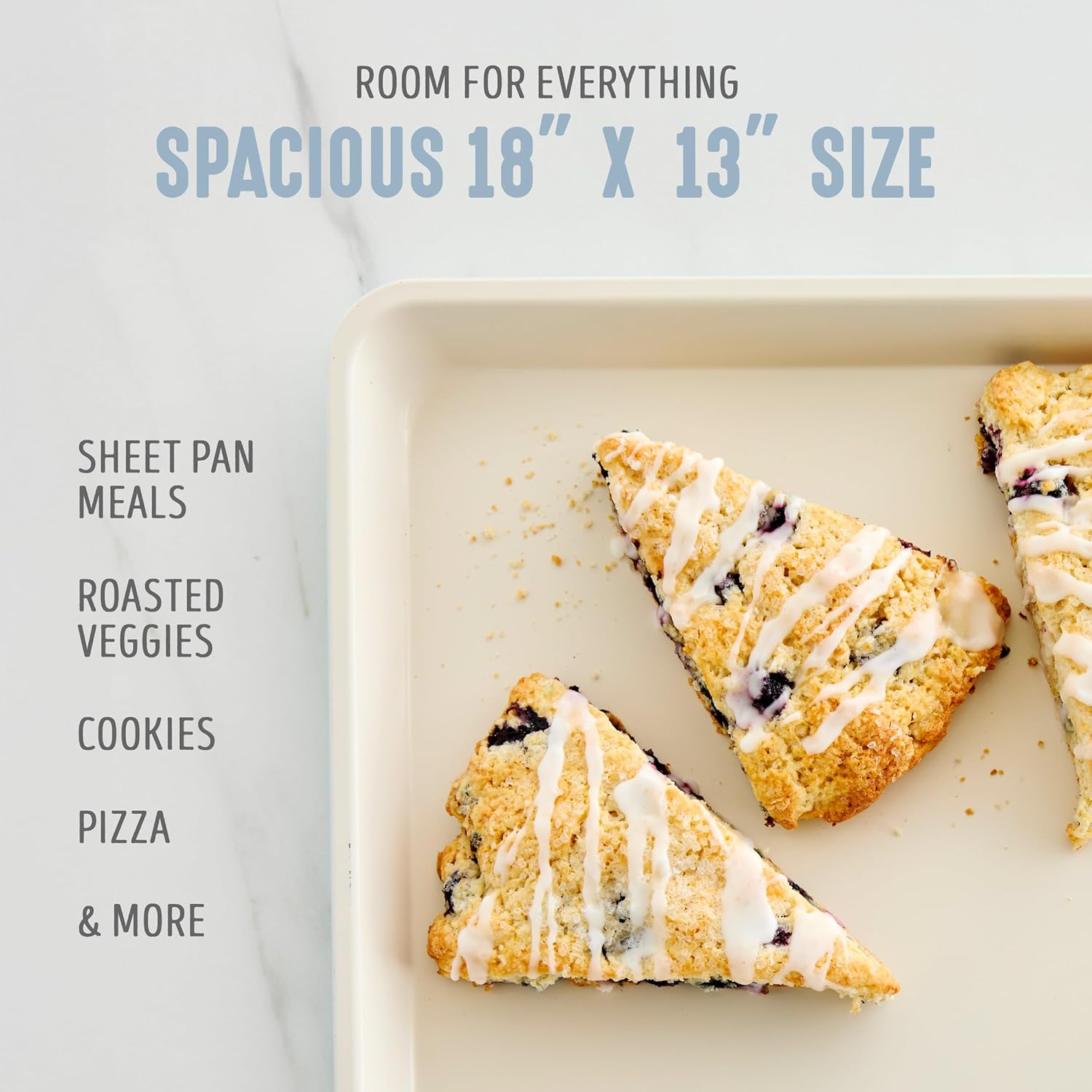 - ROOM FOR EVERYTHING: The 18” x 13” size is perfect for sheet pan meals, roasted veggies, beautifully baked cookies, and so much more.