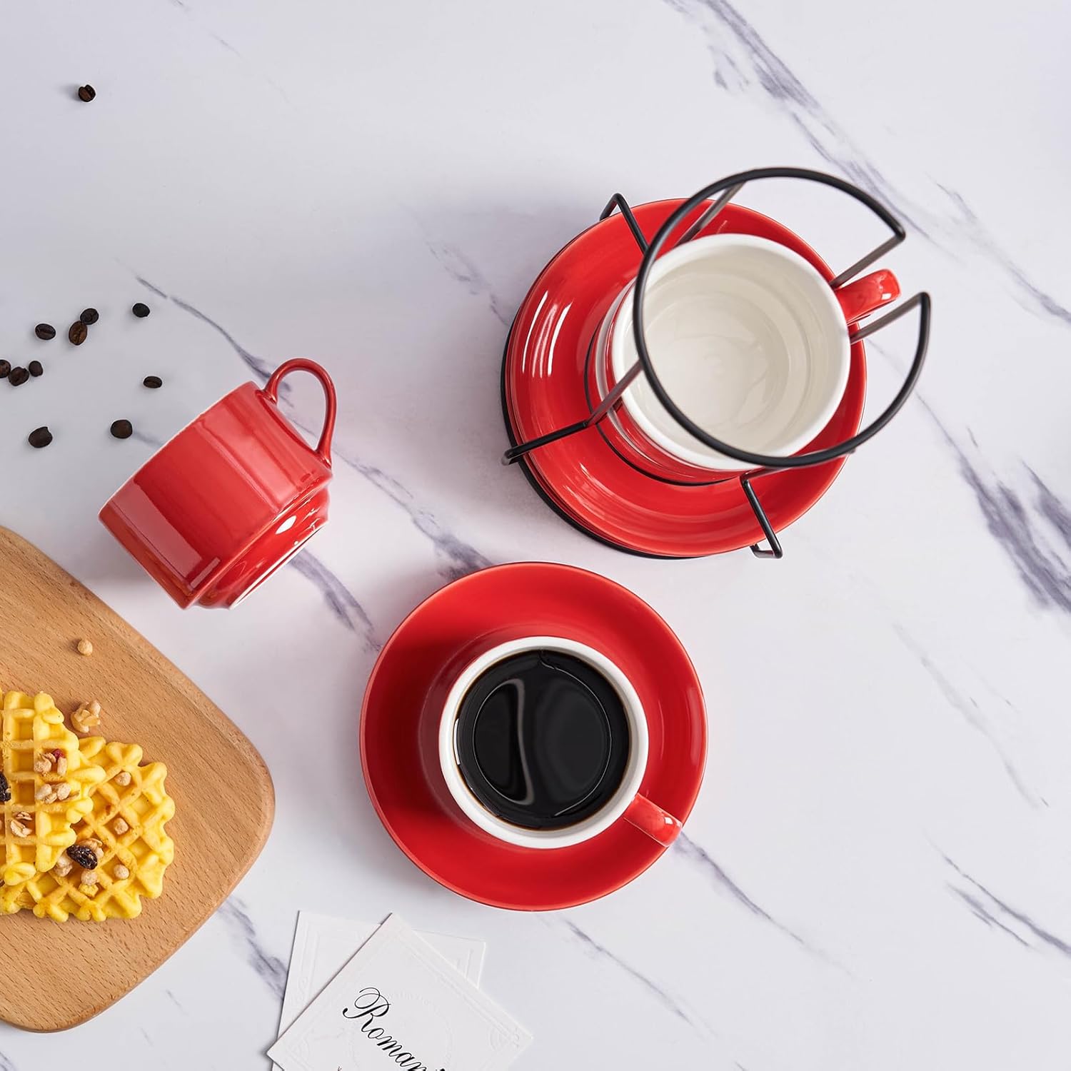 - 1. Elevate your kitchen experience with the YOLIFE Cappuccino Cups Set of 4. This set includes 4pcs 8 Ounce Cappuccino Cups with Saucers and Metal Stand, all in a classic ceramic red color. Perfect for people who enjoy coffee and conversation!