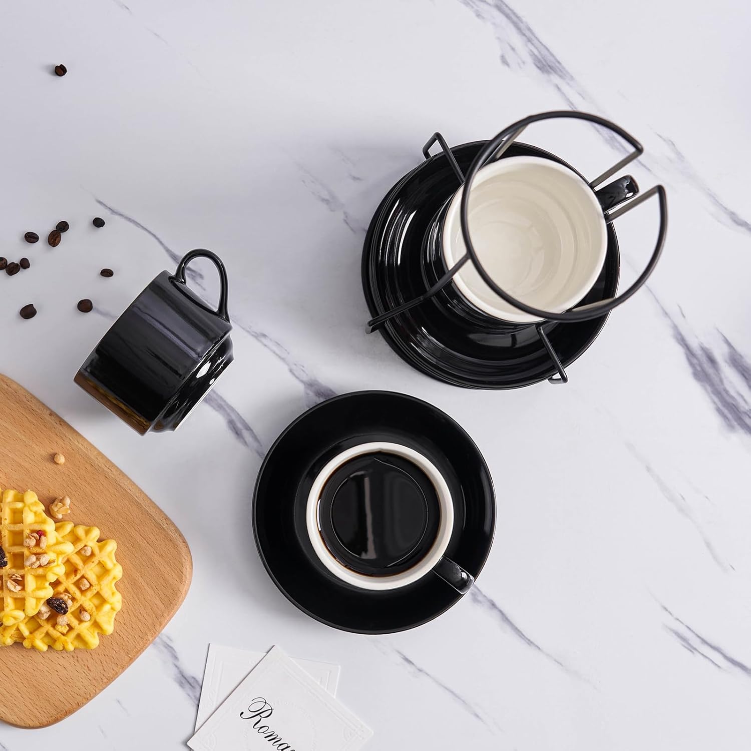 - 1. Elevate your kitchen experience with the YOLIFE Cappuccino Cups Set of 4. This set includes 4pcs 8 Ounce Cappuccino Cups with Saucers and Metal Stand, all in a classic ceramic black color. Perfect for people who enjoy coffee and conversation!
