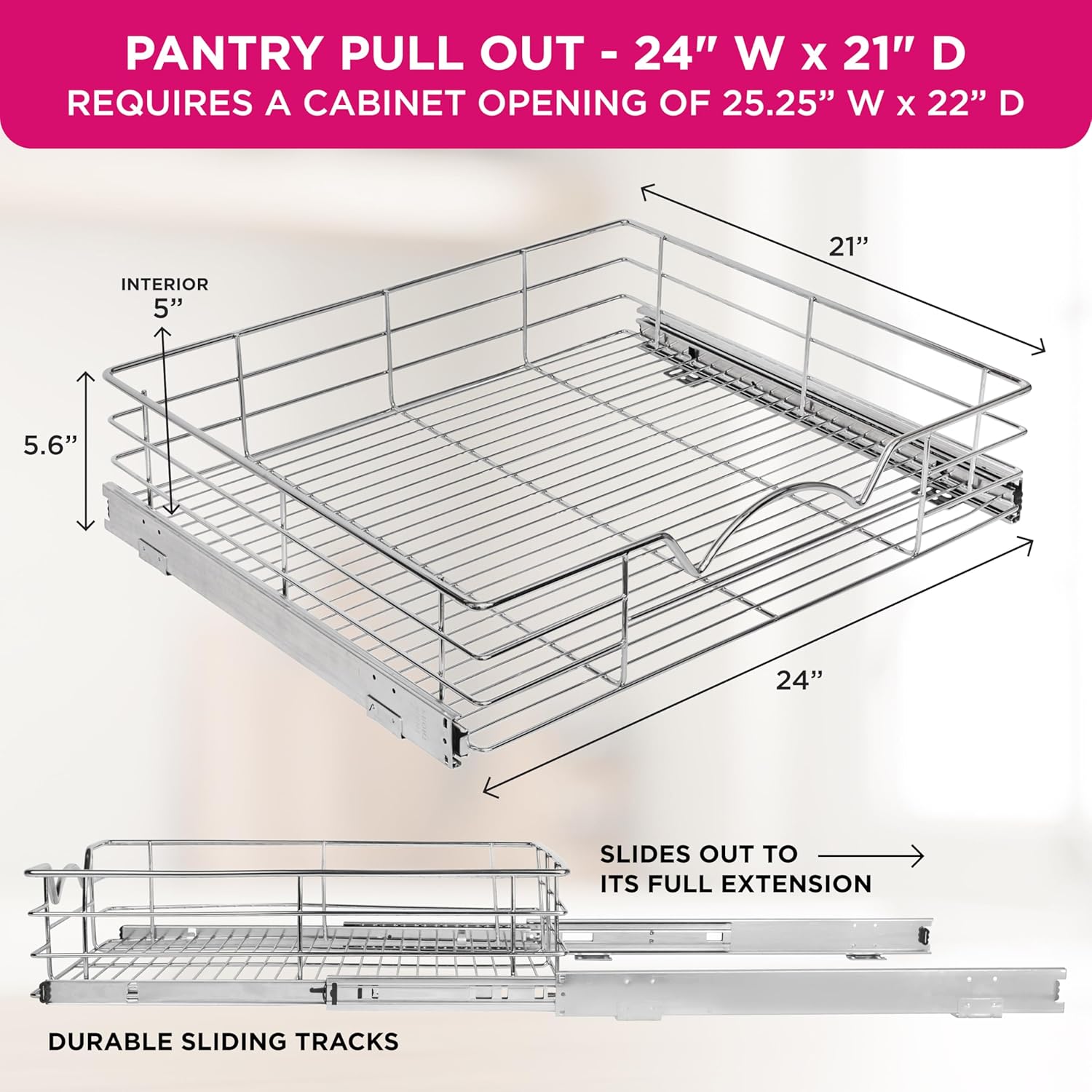 HOLDN’ STORAGE Heavy-Duty Premium Collection Pull Out Cabinet Organizer, Cabinet Drawer Slide Outs, Lifetime Limited Warranty - Basket Size 24" W x 21" D x 5" H, Anti-Rust Chrome Finish