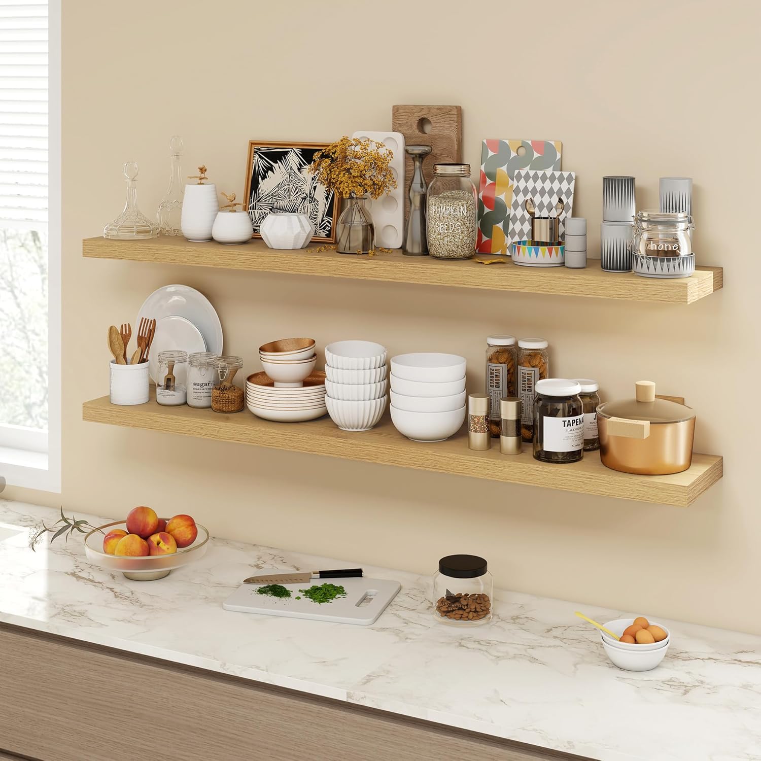 - [QUICK INSTALLATION WITH DETAILED GUIDES]: Our floating shelves include all mounting hardware and a comprehensive guide, enabling quick setup in under 10 minutes. Follow the step-by-step instructions to enjoy these beautiful shelves effortlessly, instantly upgrading your living space.