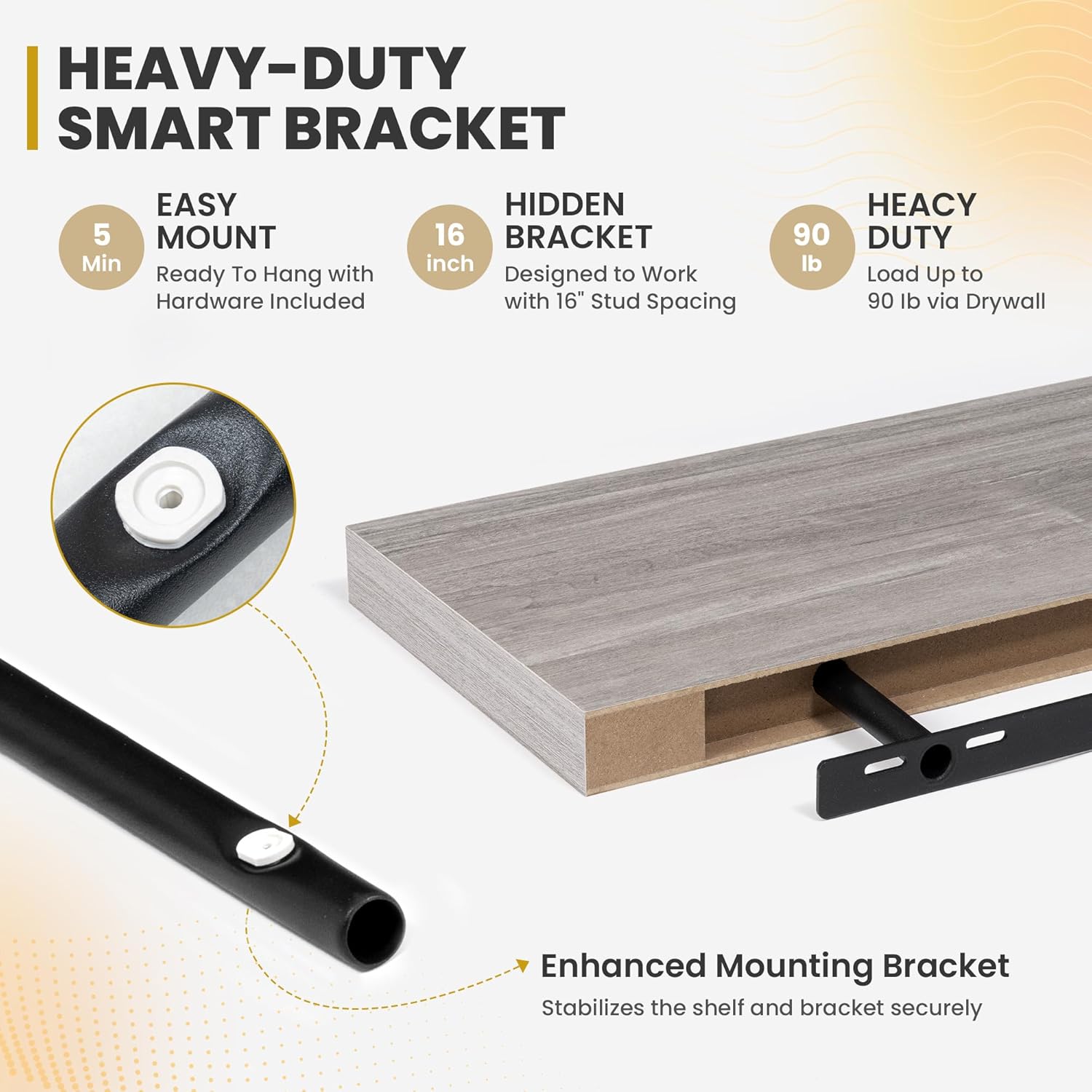 - [ROBUST & SECURE MOUNTING]: Equipped with a sturdy, hidden mounting bracket, these 55-inch floating shelves ensure solid support for your items. Designed for easy and secure installation, they come with all necessary hardware for a firm, wobble-free setup, allowing you to confidently display decor, photos, or functional items with style.