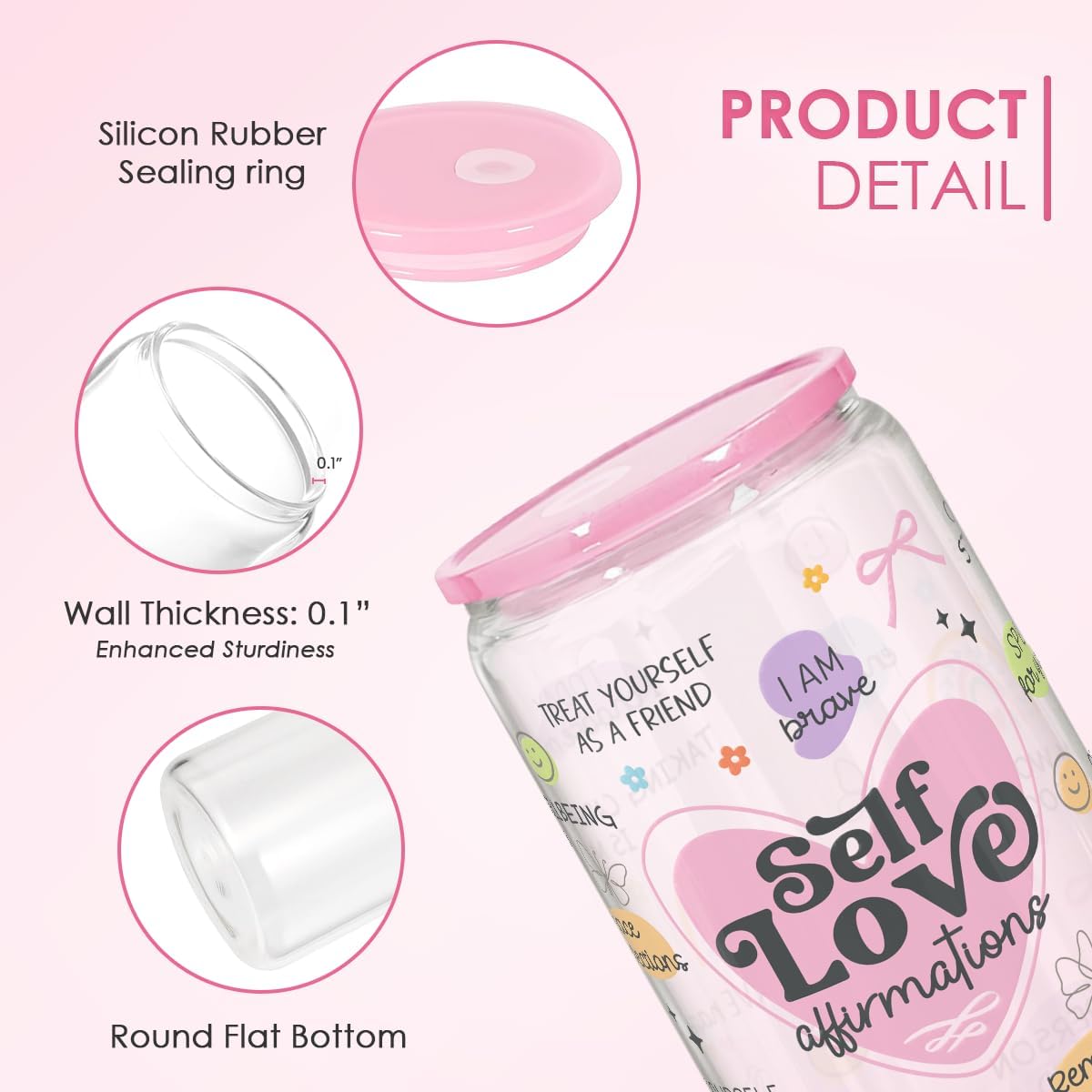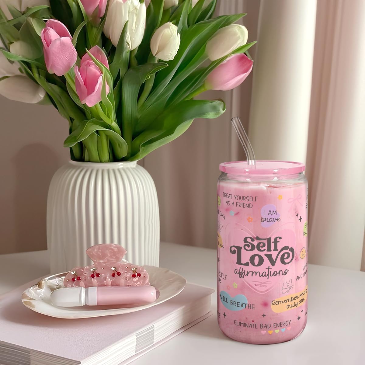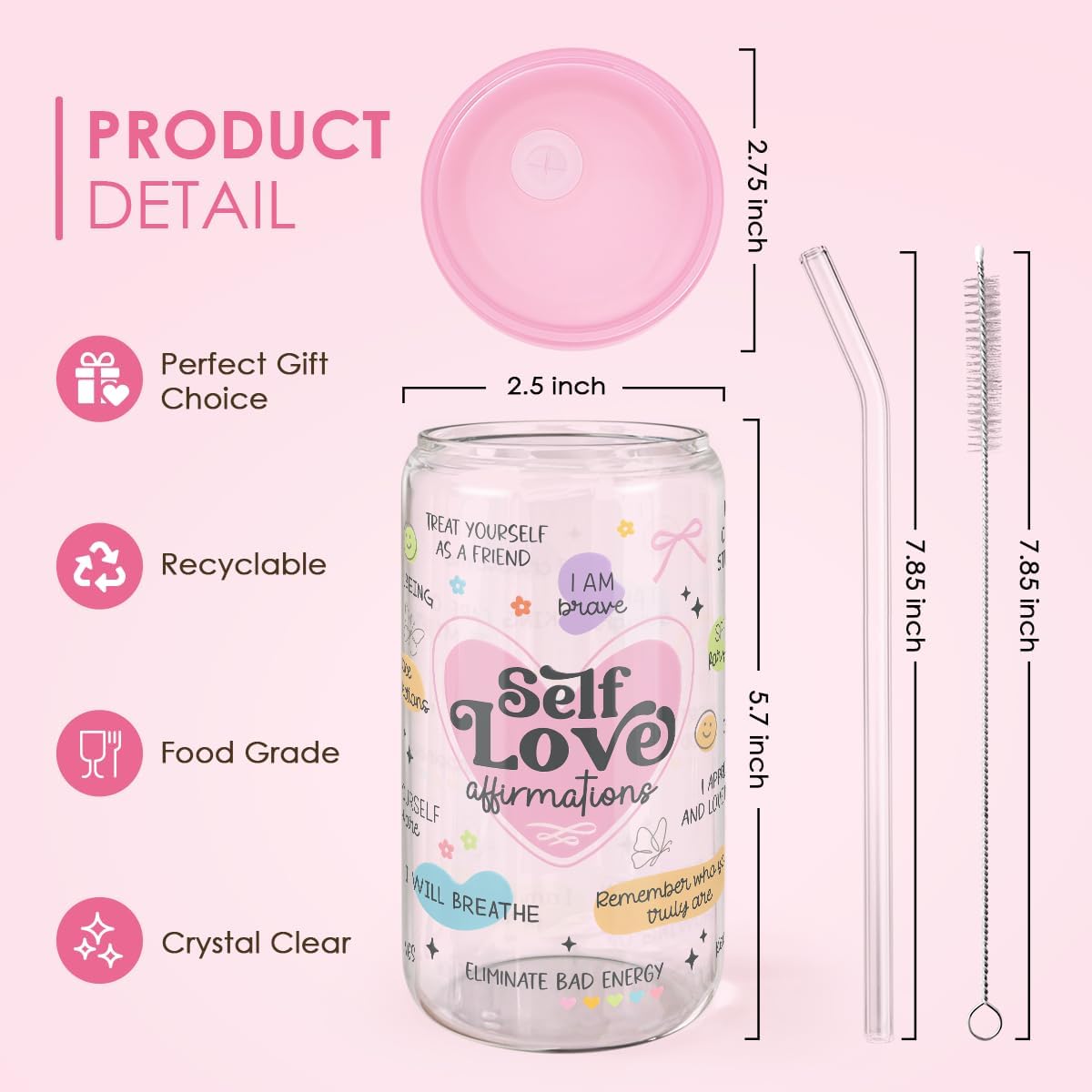 SANDJEST Inspiration Glass Can, Self Love Iced Coffee Aesthetic Cup, Gifts for Christmas Birthday, Gift for Women Girls, 16oz
