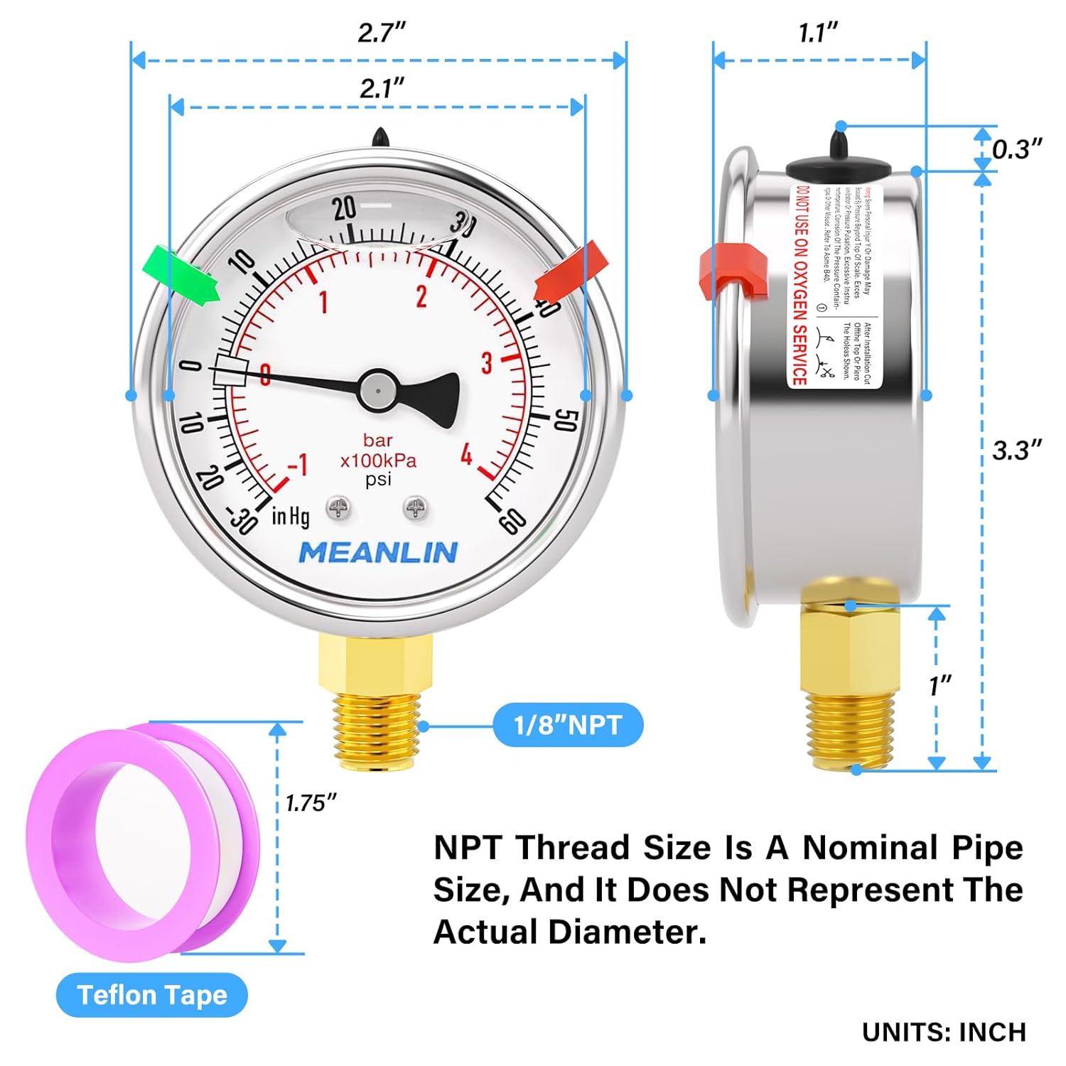 MEANLIN MEASURE -30inHG~60Psi Vacuum Pressure Gauge 1/8" NPT 2.5" FACE DIAL, Stainless Steel Liquid Filled Pressure Gauge WOG Water Oil Air Lower Mount (with 2PCS Snaps)