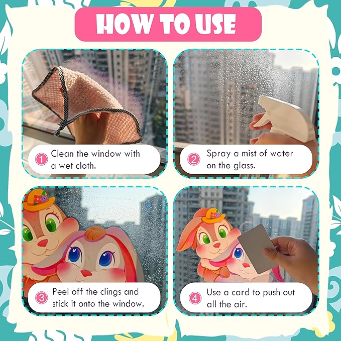- EASY TO USE - KAHSHEEN static Easter window stickers can be easily pasted on smooth surfaces such as glass, just clean the target surface with a damp towel, then peel the sticker from the paper and stick it on the wet and clean smooth surface, press it for a while and it will stick tightly.