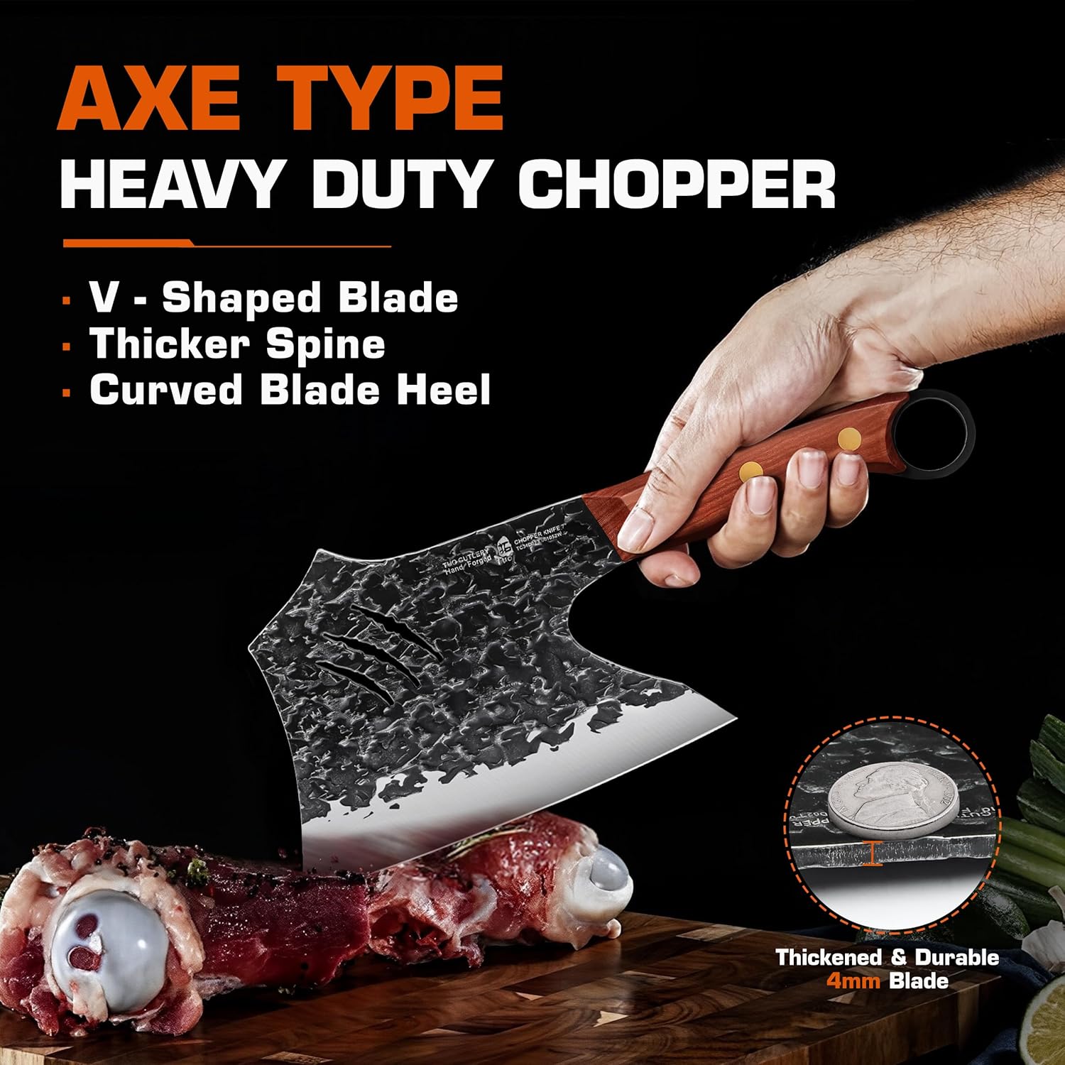 - 【Wild Craftsmanship】Thickened 4mm hammered blade with rugged spine and tapered edge. This axe type bone knife delivers optimal splitting force for heavy-duty chopping through pork ribs, and disjointing beef shanks.