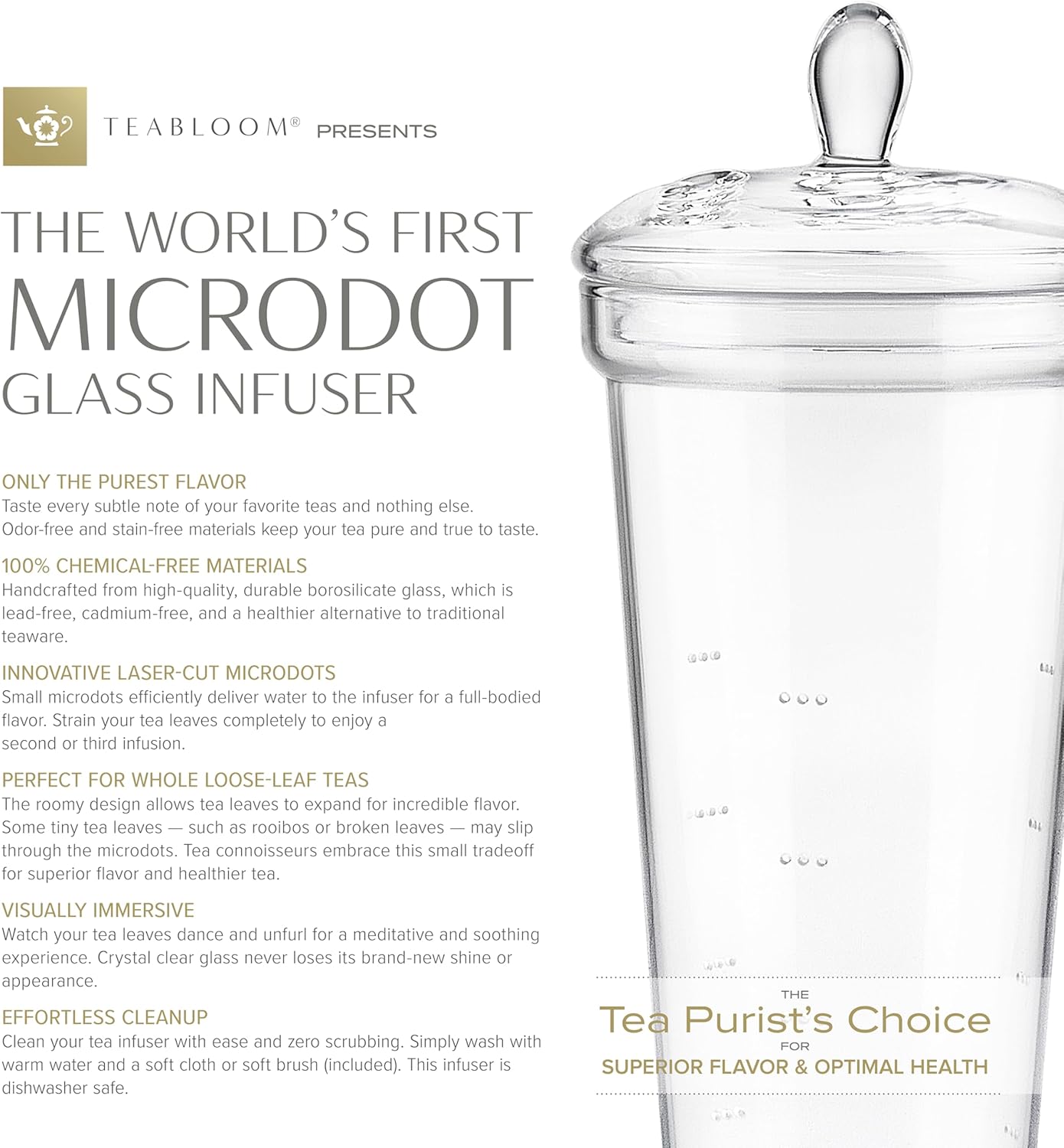 - A Purist’s Choice – Our ultra-fine microdot glass infuser allows whole leaf teas to fully expand and release their natural flavors, creating a richer and more authentic tea experience. Tea connoisseurs embrace the slight trade-off: while ultra-fine tea leaves (such as rooibos or broken, dusty tea particles) may occasionally pass through, this results in a more natural, full-bodied tea experience.