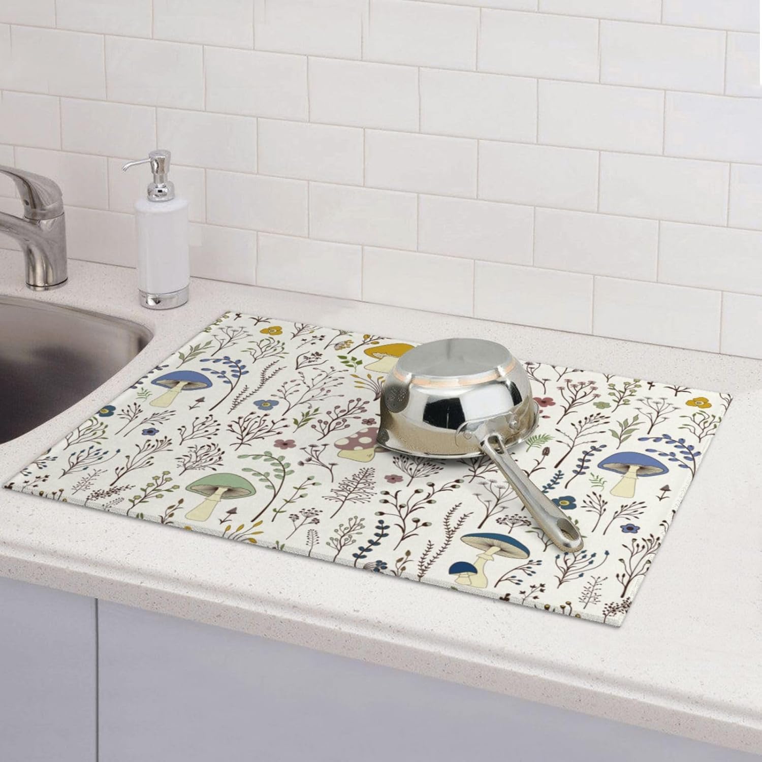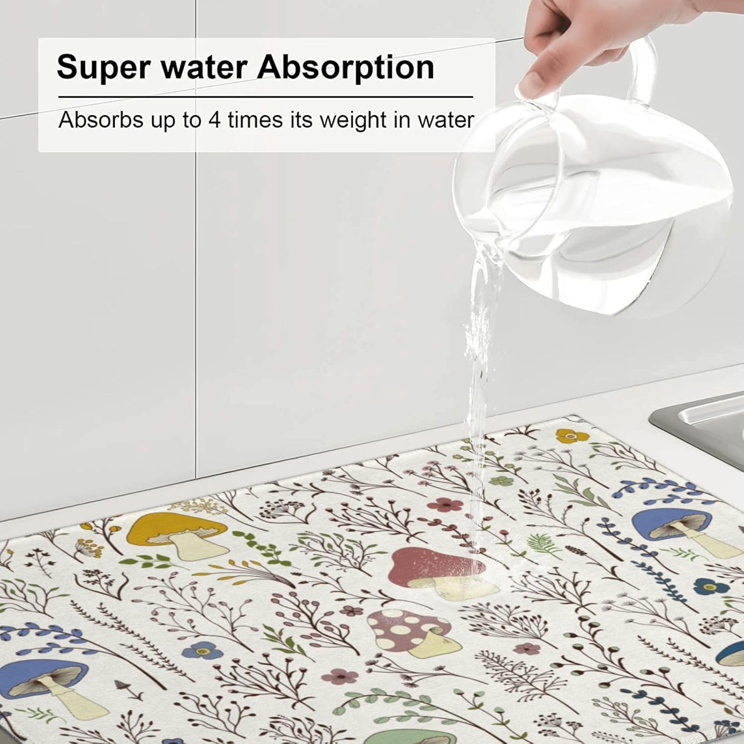Cute Mushrooms Wild Plant Dish Drying Mat 18"x24" Microfiber Absorbent Fast Dry Mat for Kitchen Counter Coffee Bar Colored Mushroom Large Drying Mat Kitchen Decor Gifts
