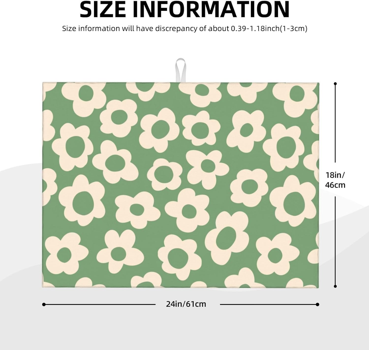 Floral Kitchen Dish Drying Mat for Dishes 18x24 Inch Vintage Groovy Flowers Drying Mat White Daisy Dish Drainer Mat Super Absorbent Dish Rack Pad for Coffee Bar Sinks(Green)