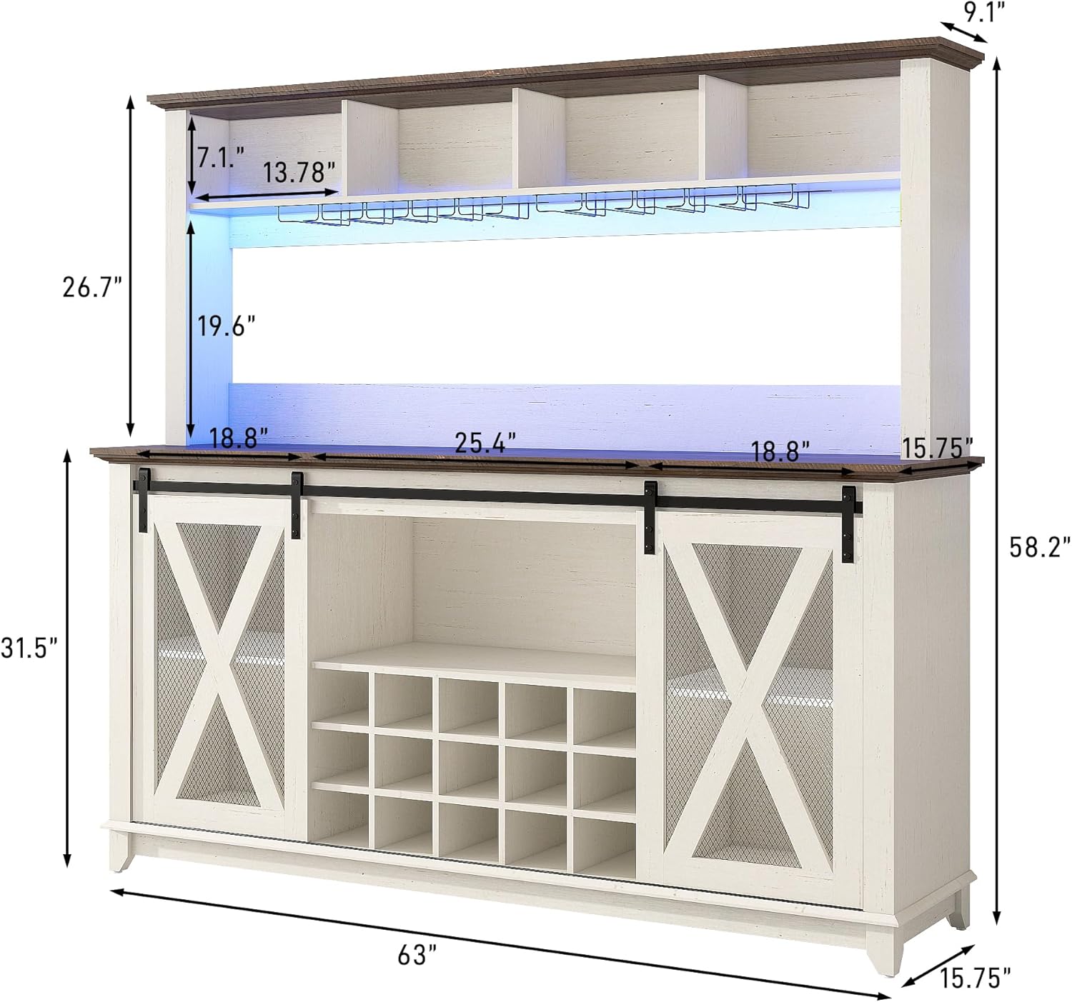63"Wide 58"H Farmhouse Coffee Bar Cabinet with LED Light,Wine Bar Cabinet w/ 4 Storage Hutch,Kitchen Buffet Cabinet w/Sliding Barn Door & 15 Wine and Glass Racks for Kitchen Dining Room(Antique White)