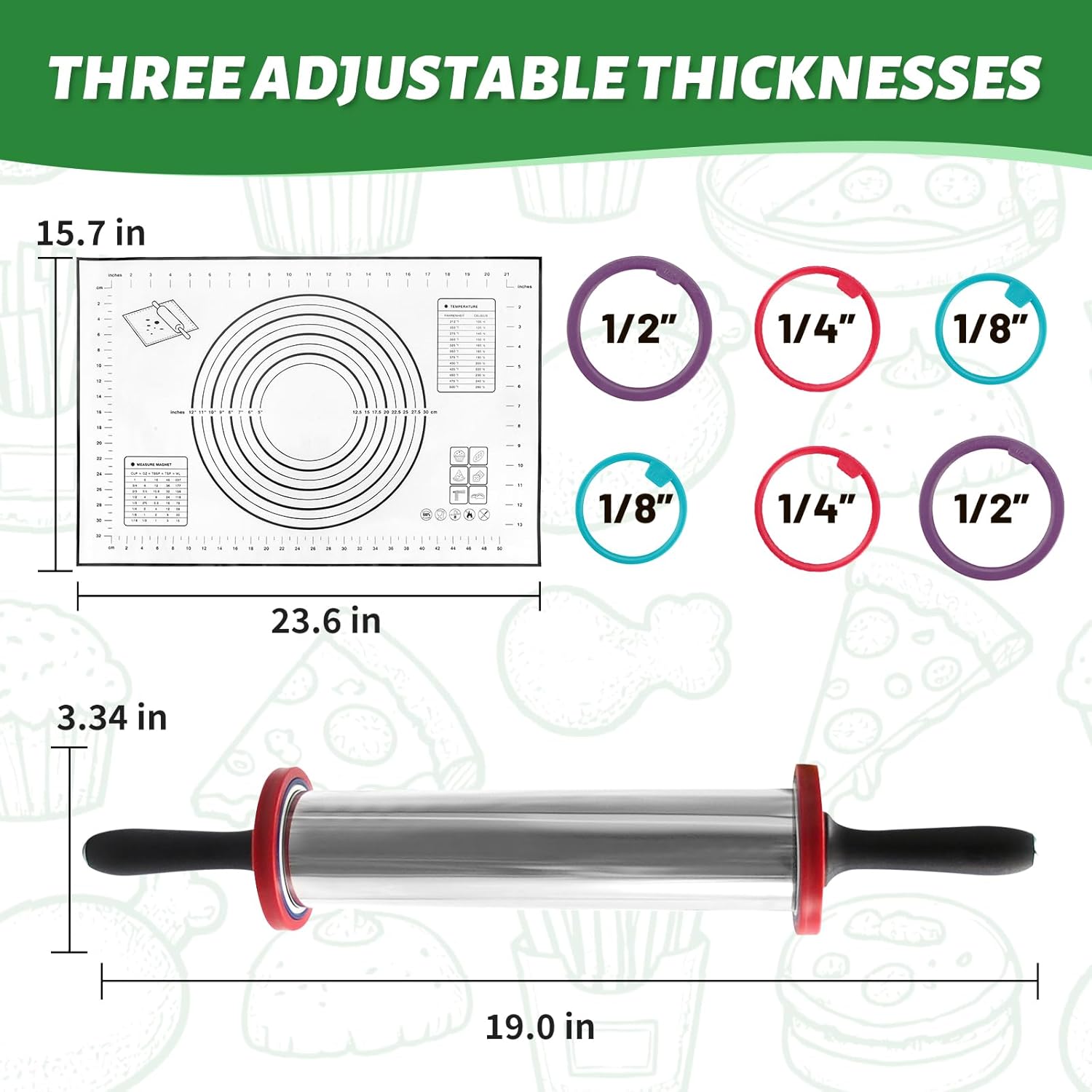 Rolling Pins,Rolling Pin and Silicone Baking Pastry Mat Set,Rolling Pins,Adjustable Stainless Steel Rolling Pin with Thickness Rings for Baking Dough,Pizza,Pie,Pasta(Black Mat)