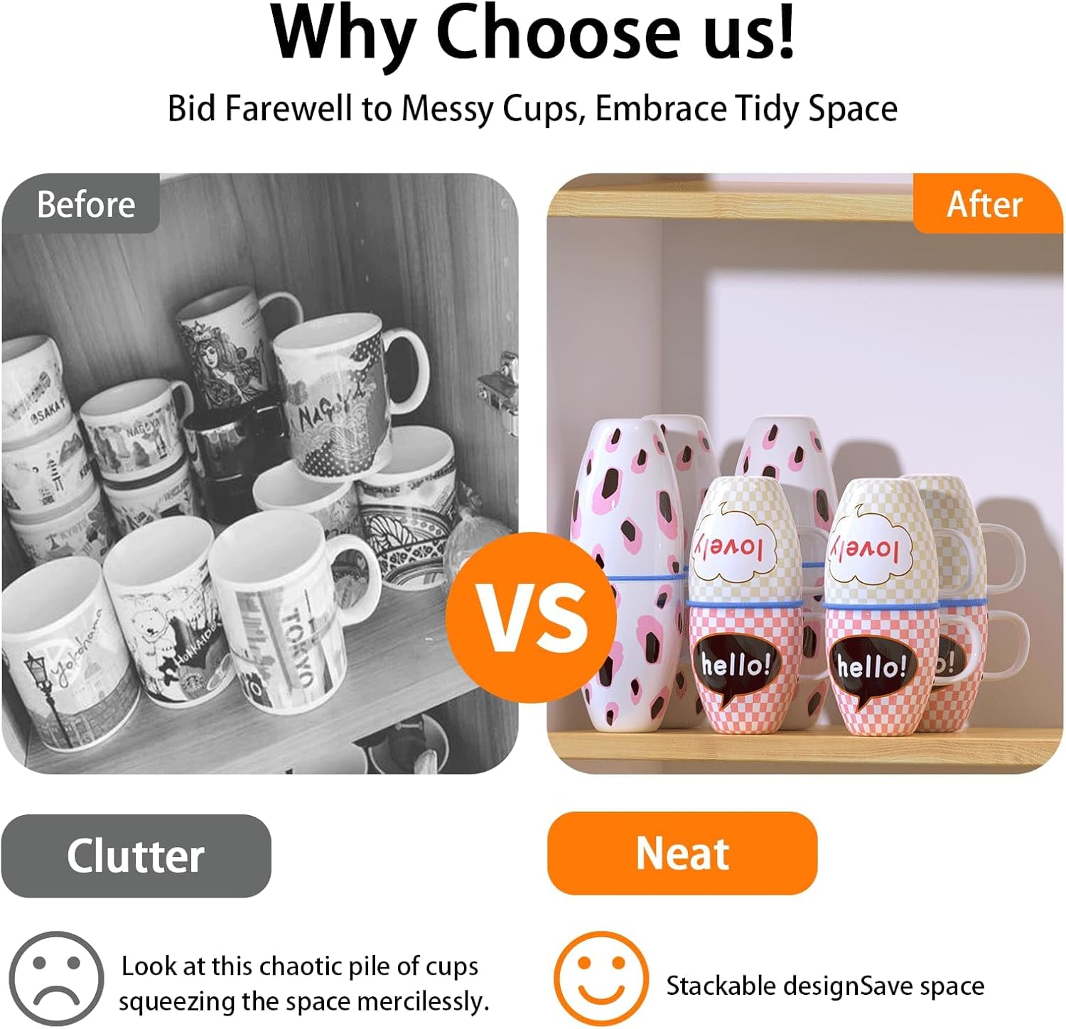 - Easy to Use & Setup – Simply place one Stacker on top of a cup, then place another upside-down on top. Gently squeeze the stacker to adjust it to the size of your mugs, and you’ll have a secure and organized storage solution in no time. 🔔For use only with round-mouthed cups with diameters between 1.5-3.9" (3.8-9.9 cm)