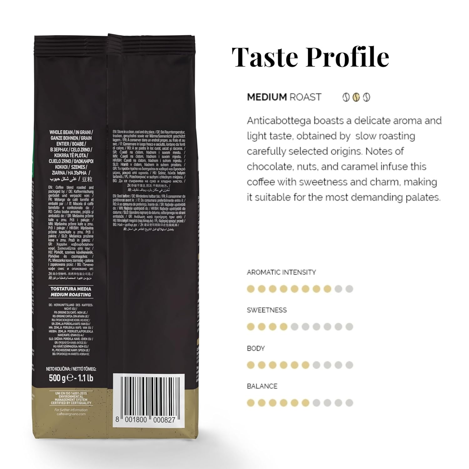- Delicate Antica Bottega Profile: Antica Bottega features a sweet, balanced intensity (5/10) with delightful notes of caramel, nuts, and chocolate. Slow-roasted for perfection, it’s ideal for coffee enthusiasts who value nuanced and elegant flavors.